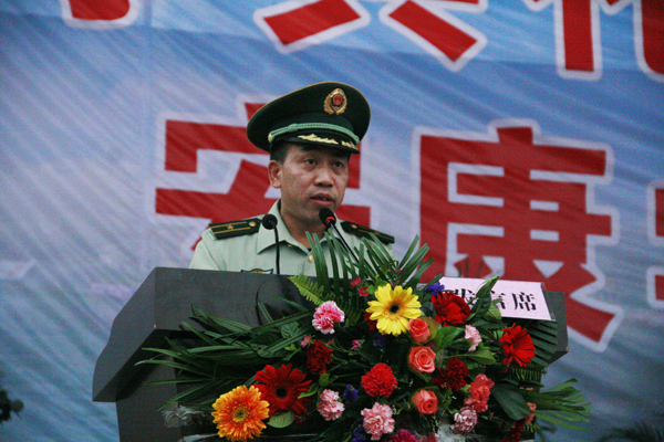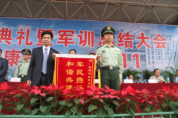 陈刚副院长代表学院向承训部队赠送锦旗,对武警安康支队长期以来对我院军训工作的大力支持表示感谢。