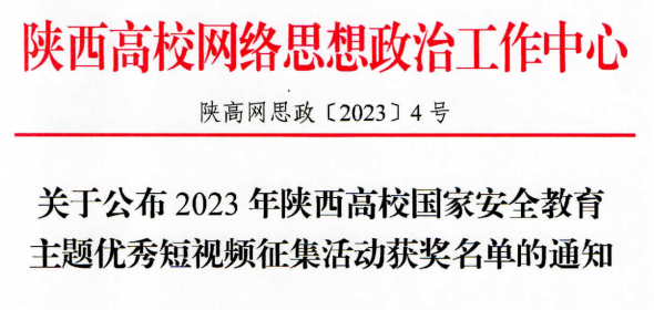 近日,由陕西高校网络思想政治工作中心主办的“2023年陕西高校国家安全教育主题优秀短视频征集活动”结果揭晓,我校易班发展中心推荐的学生原创短视频作品,荣获三等奖三部(团队)、优秀奖两部(团队)。