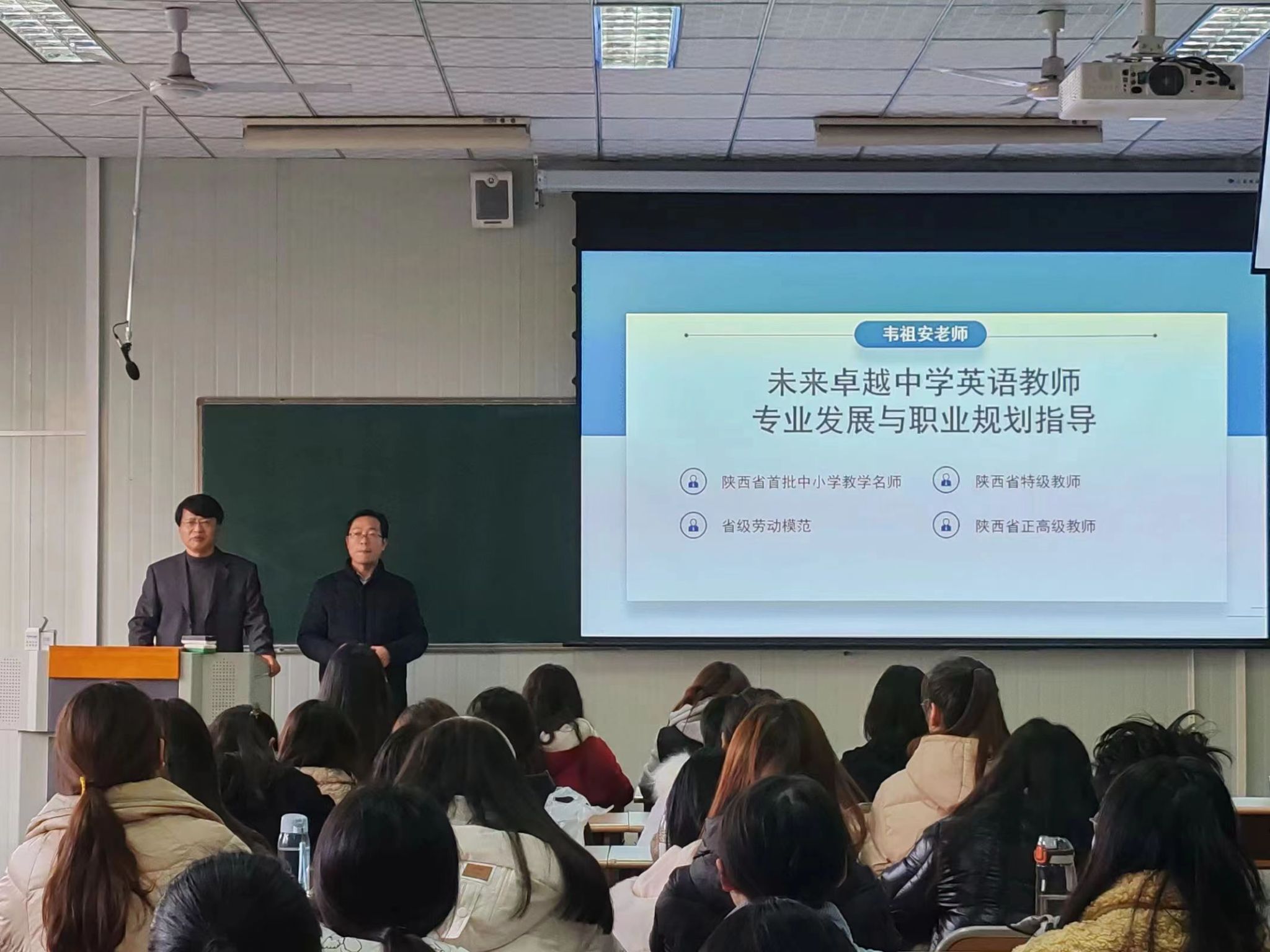 近日,应我校外语学院邀请,陕西省中小学教学名师、汉滨高中原副校长韦祖安为外语学院卓越中学英语教师实验班全体学生做了题为“新时代未来卓越中学英语教师专业发展与职业规划指导”的专题讲座。外语学院领导班子、教师教育团队教师及卓越班全体学员参加了本次讲座。