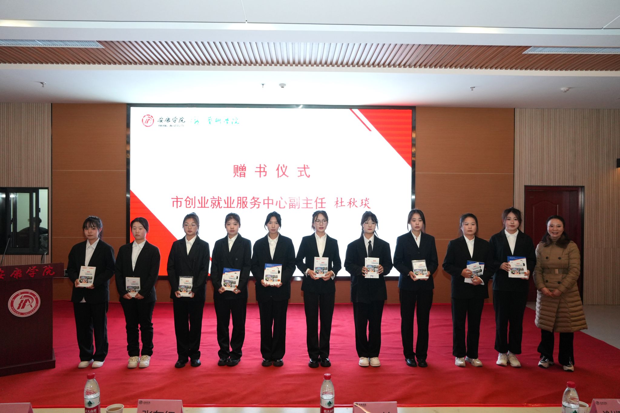 杜秋琰为女大学生代表赠送书籍《安康市区稳就业促发展惠民生政策服务指南》《细节决定成败》。