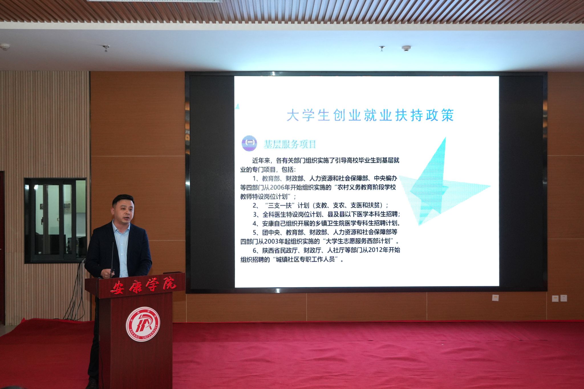 安康市创业就业服务中心毕业生工作科马思民讲解了高校毕业生自主创业优惠政策,提振了学生积极就业创业的信心,帮助学生以更加理性、平和的心态面对未来发展之路。陕西省人大代表、省三八红旗手、全国巾帼建功标兵、心理咨询师缪晓红从就业压力缓解、情绪管理和人际交往等方面进行讲述,引导学生关注心理健康,正确缓解就业创业过程中的心理焦虑和压力。
