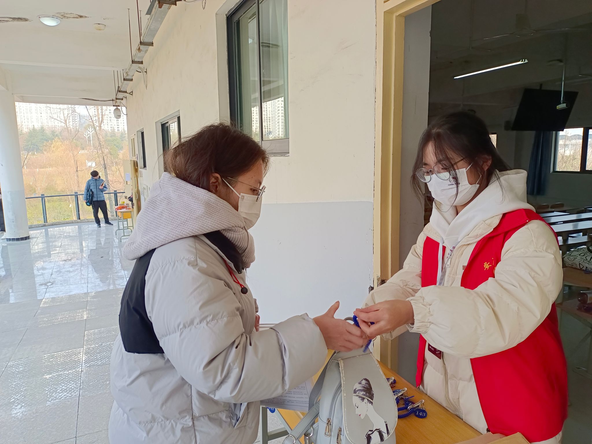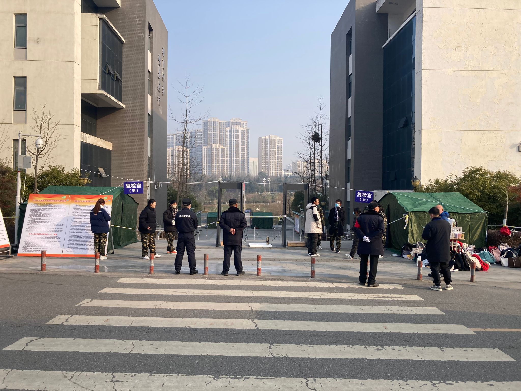 今年,防范手机等高科技作弊是研考安全的重中之重。我校考点首次配备智能安检门4台、物品存放处6间,每个考场均配备手持金属探测器、无线电信号屏蔽仪。考前,通过多种渠道做好信息发布和政策解读,并就考生入校组织、考场引导、手机存放、安检门入场等场景开展实地模拟演练。考试期间,工作组因时因地现场调度,安排学生志愿者现场引导,考生寄存物品、安检入场、离场休息等环节井然有序。严格考生入楼、入场、如厕“三检”工作,实现考场封闭区域安检全覆盖,确保手机“带不进”“用不了”“传不出”,进一步守住考场安全的“主阵地”。