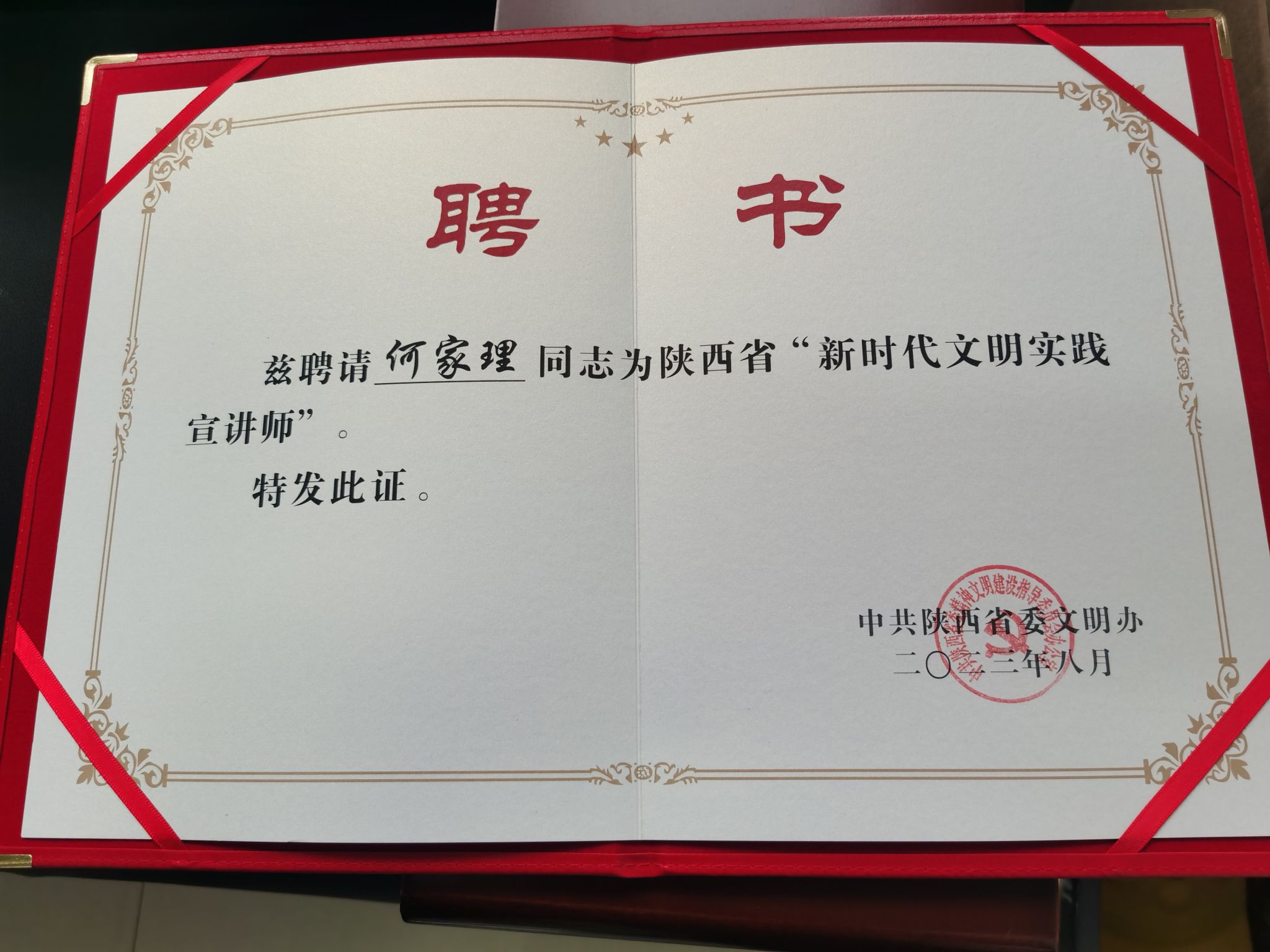 2023年8月,陕西省文明办文件通知,要求各市组织推荐陕西省“新时代文明实践宣讲师”,我校党委宣传部积极组织申报,推荐马克思主义学院何家理教授填报申请材料、录制《乡村振兴战略的背景及实施路径探讨》微视频报送安康市文明办联评,后上报省文明办经过联评何家理被聘为陕西省“新时代文明实践宣讲师”。