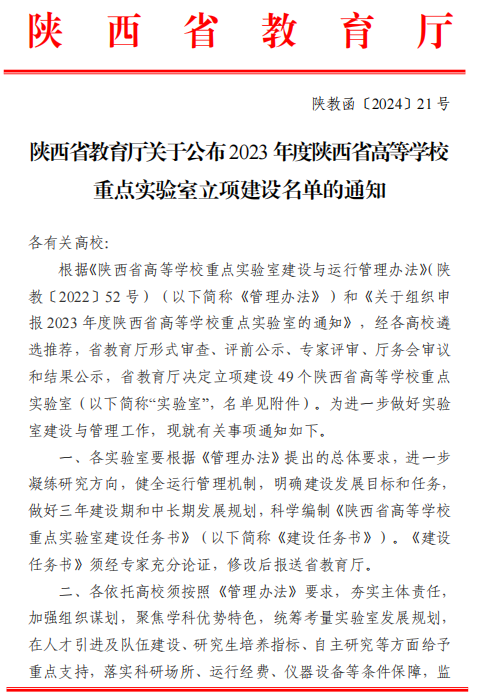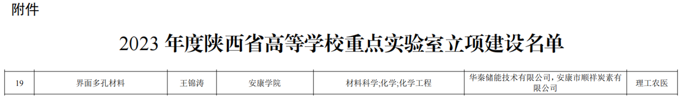 近日,陕西省教育厅发布了《陕西省教育厅关于公布2023年度陕西省高等学校重点实验室立项建设名单的通知》,我校科创驿站驻站科技人员、化工学院青年教师王锦涛博士牵头申报的“界面多孔材料陕西省高等学校重点实验室”获批立项建设。