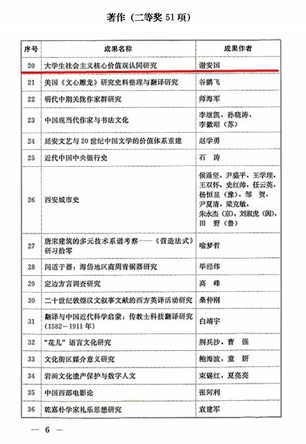 近日,陕西省人民政府发布了关于表彰第十六次哲学社会科学优秀成果的通报,我校谢安国教授科研成果《大学生社会主义核心价值观认同研究》荣获著作类二等奖。