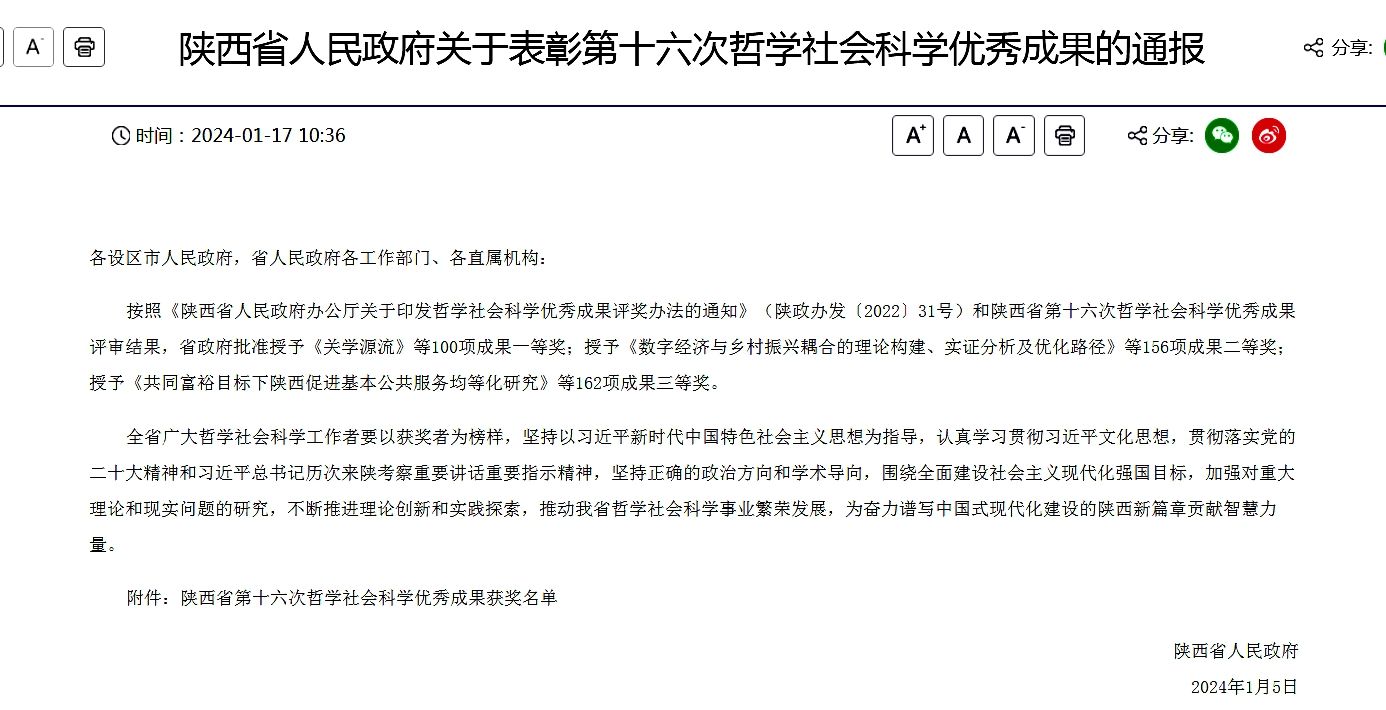陕西省哲学社会科学优秀成果奖是陕西省哲学社会科学领域内的最高奖项,获奖成果将由省人民政府进行表彰并颁发证书。该奖项集中展示了近年来陕西省哲学社会科学研究的优秀成果,有力地调动和激发了广大哲学社会科学工作者的科研积极性和创造性,发挥了引领陕西哲学社会科学繁荣发展的重要作用。