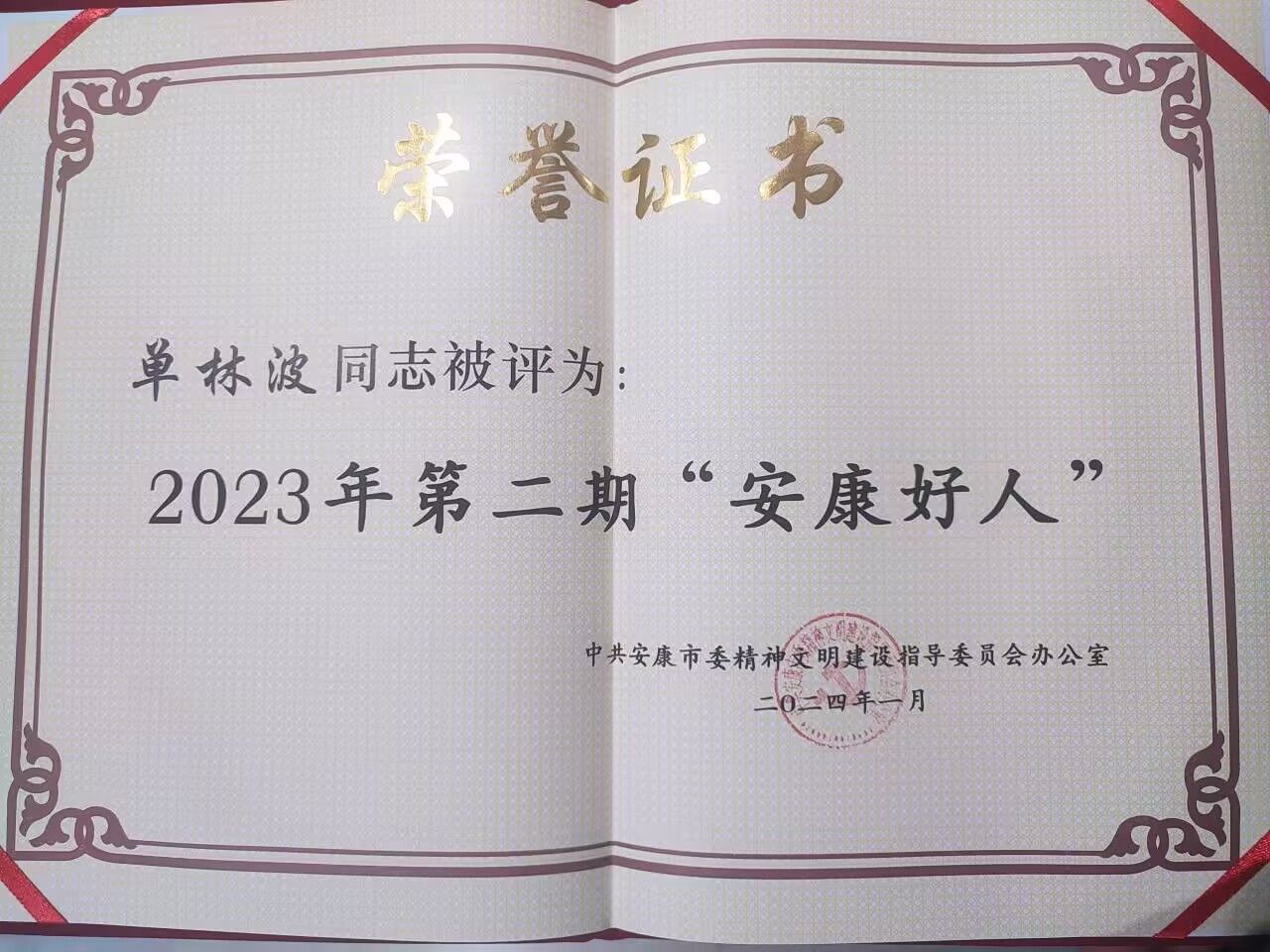 近日,安康市委文明办发布2023年第二期“安康好人”榜单,共评出33人(组),我校单林波同志被命名为敬业奉献类“安康好人”。