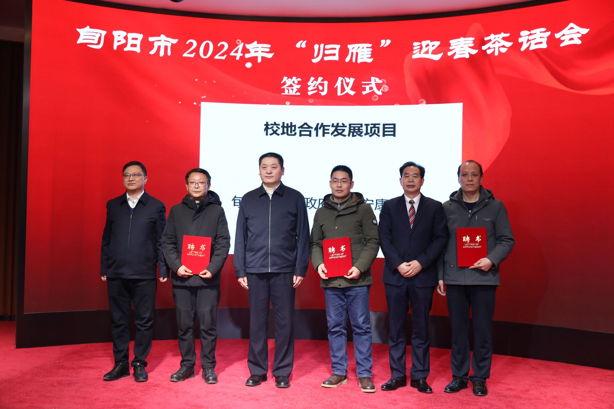 余谦和旬阳市委常委、副市长杨居侨代表双方签订合作协议,并聘请文传学院院长杨运庚专家团队为旬阳文旅智库专家,化工学院副院长袁光辉专家团队为旬阳新型材料智库专家,农生学院副教授廖咸康专家团队为旬阳特色林果发展智库专家,旬阳市相关领导为三位专家颁发了聘书。