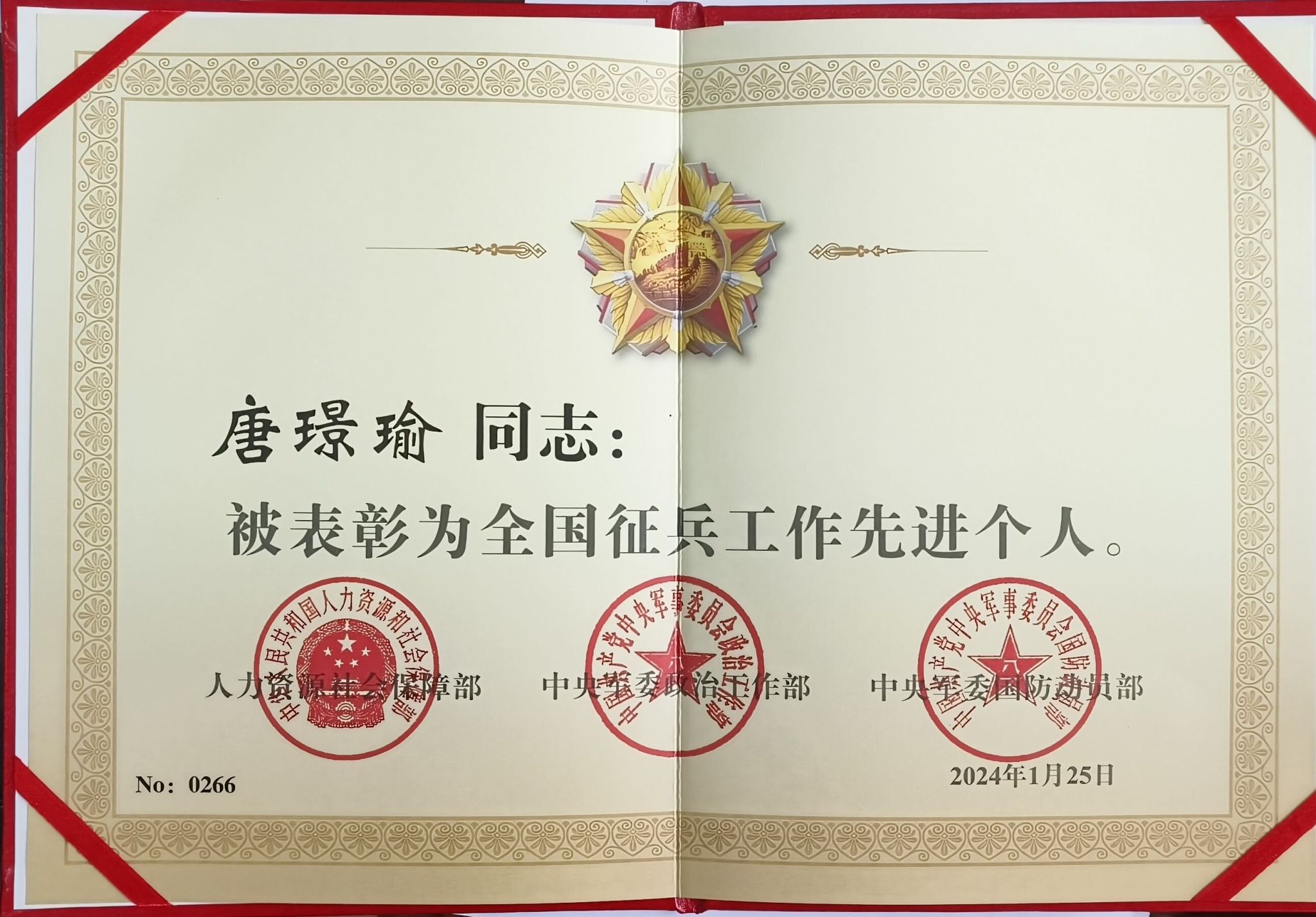 近日,2024年全国征兵工作暨表彰大会在北京召开。会议通报表彰了全国征兵工作先进单位和先进个人。我校学生工作部(武装部)征兵工作站干事唐璟瑜被人力资源和社会保障部、中央军委政治工作部、中央军委国防动员部联合表彰为“全国征兵工作先进个人”。陕西省军队和地方共11人获此殊荣,全省高校仅安康学院获此表彰。