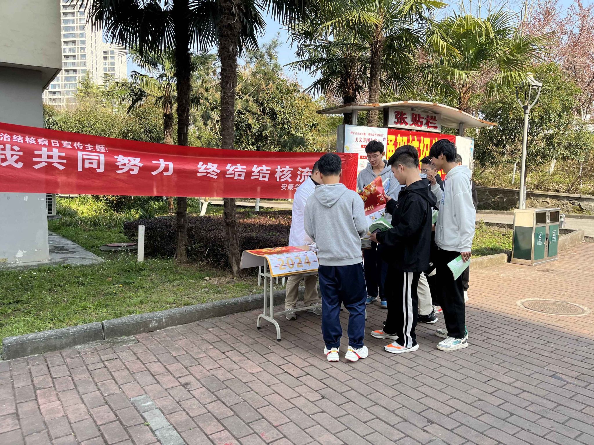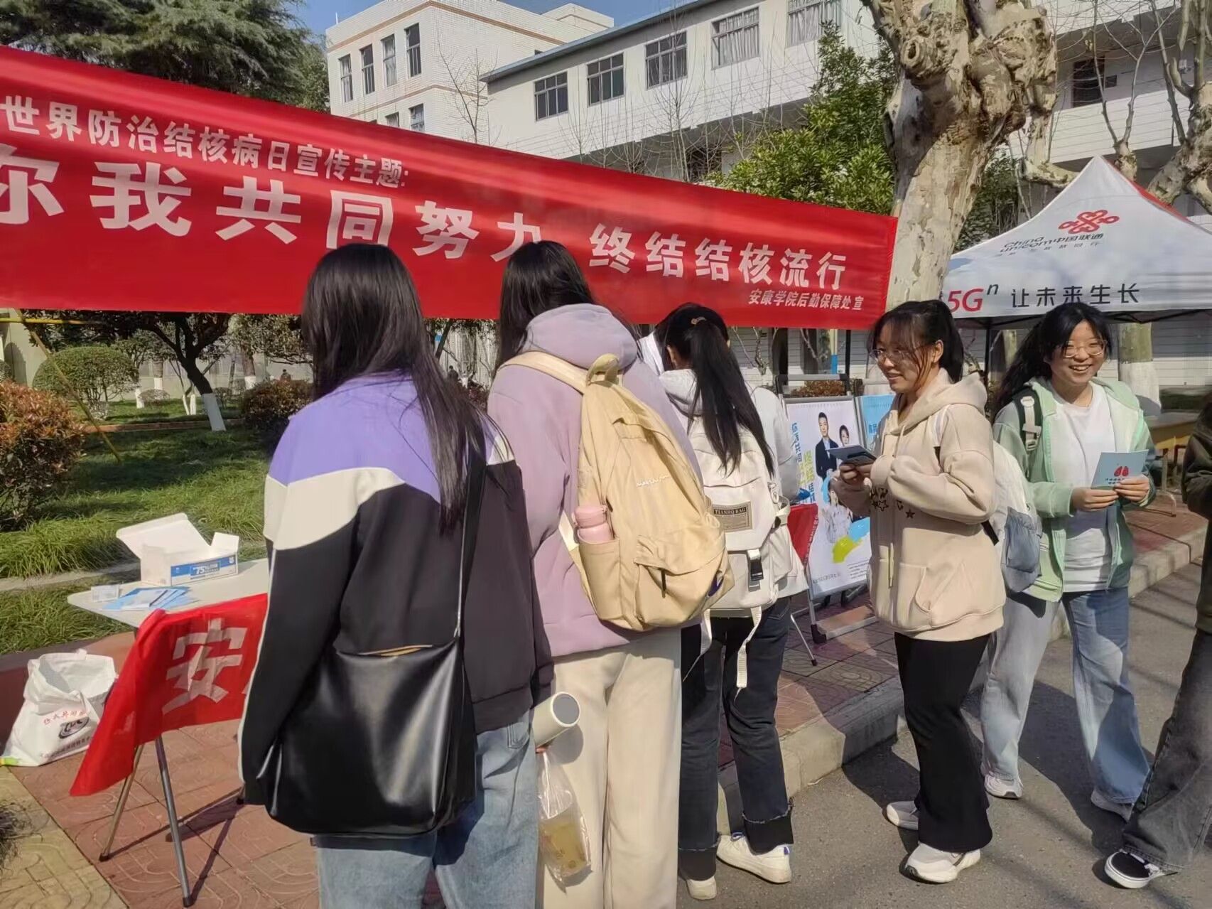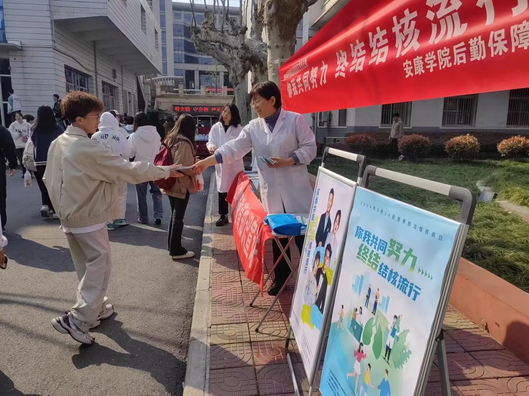 学校通过在LED屏播放宣传标语、校园摆放海报展架、发放结核病防治知识手册、宣传品等形式,广泛宣传相关知识。校医疗保健服务中心工作人员分别在江南校区林荫大道、江北食堂前小广场等处设立宣传点,现场解答师生疑问,帮助大家正确认识结核病的防治措施。