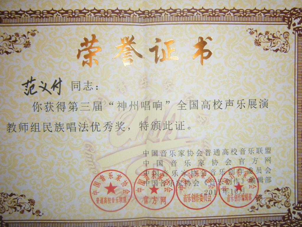 在刚刚结束的第三届“神州唱响”全国高校声乐展演比赛中,我院艺术系范义付老师获教师组民族唱法优秀奖。
