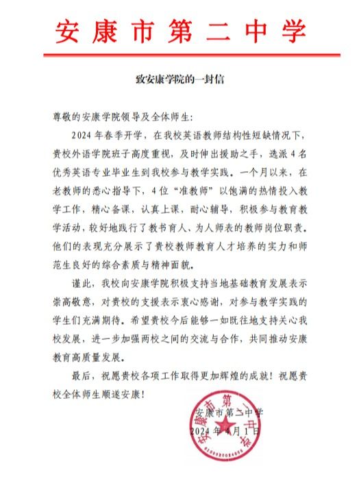 近日,安康市第二中学向我校发来感谢信,对我校选派四位英语专业师范生到该校顶岗担任英语教师表示诚挚谢意。