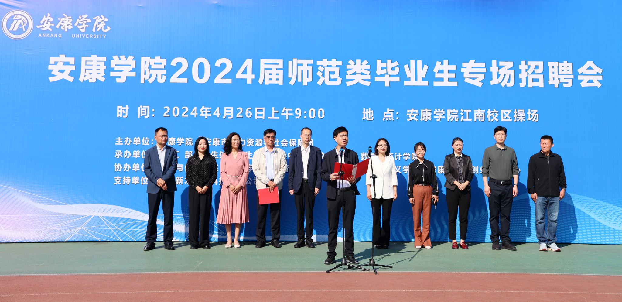 4月26日,安康学院2024届师范类毕业生专场招聘会在江南校区田径场成功举办。学校党委委员、副校长屈险峰,安康市创业就业服务中心副主任余小丽、安康高新区创业就业服务中心主任杨成义,相关二级学院党总支书记、院长出席开幕式。开幕式由就业指导中心主任李岩主持。