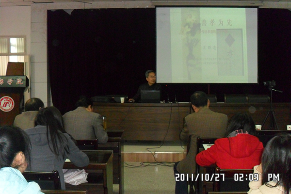 肖教授从孝的含义在中国文化中的地位、孝道的伦理精神本质、孝道规范系统三个方面论述了中国传统文化中孝的时代价值,指出改革开放30年在经济建设取得巨大成就的同时,传统伦理文化的复兴对建立世界文明国家的重要性。讲座结束后肖教授回答了师生提出的问题。