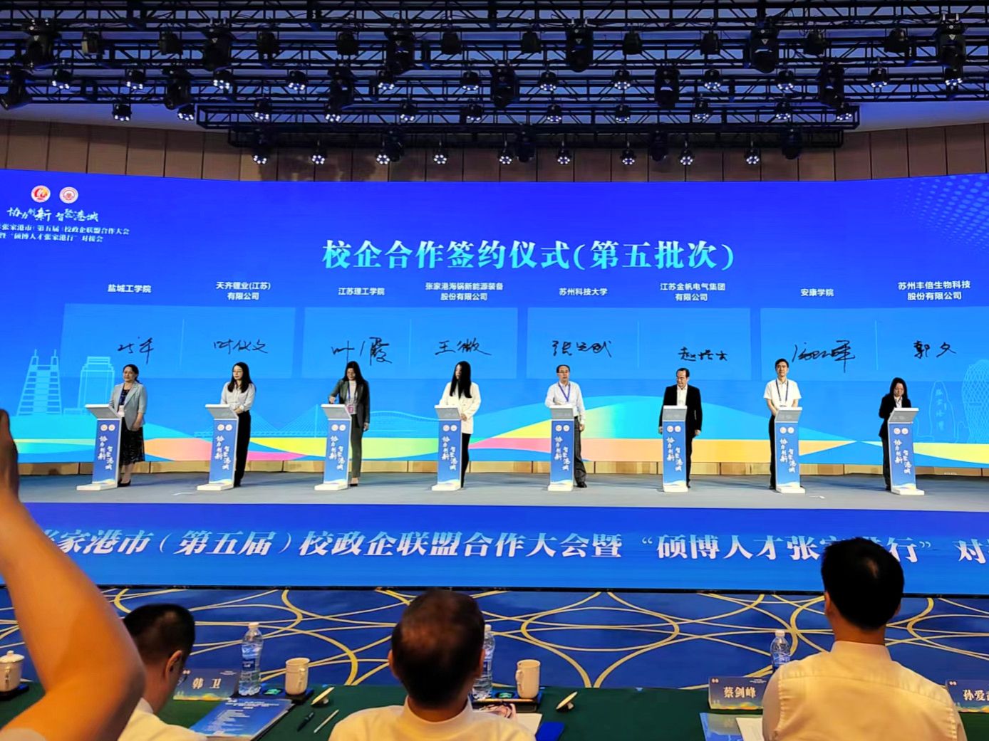 校政企合作会上,屈险峰代表学校与江苏丰倍生物科技有限公司签订校企合作协议。
