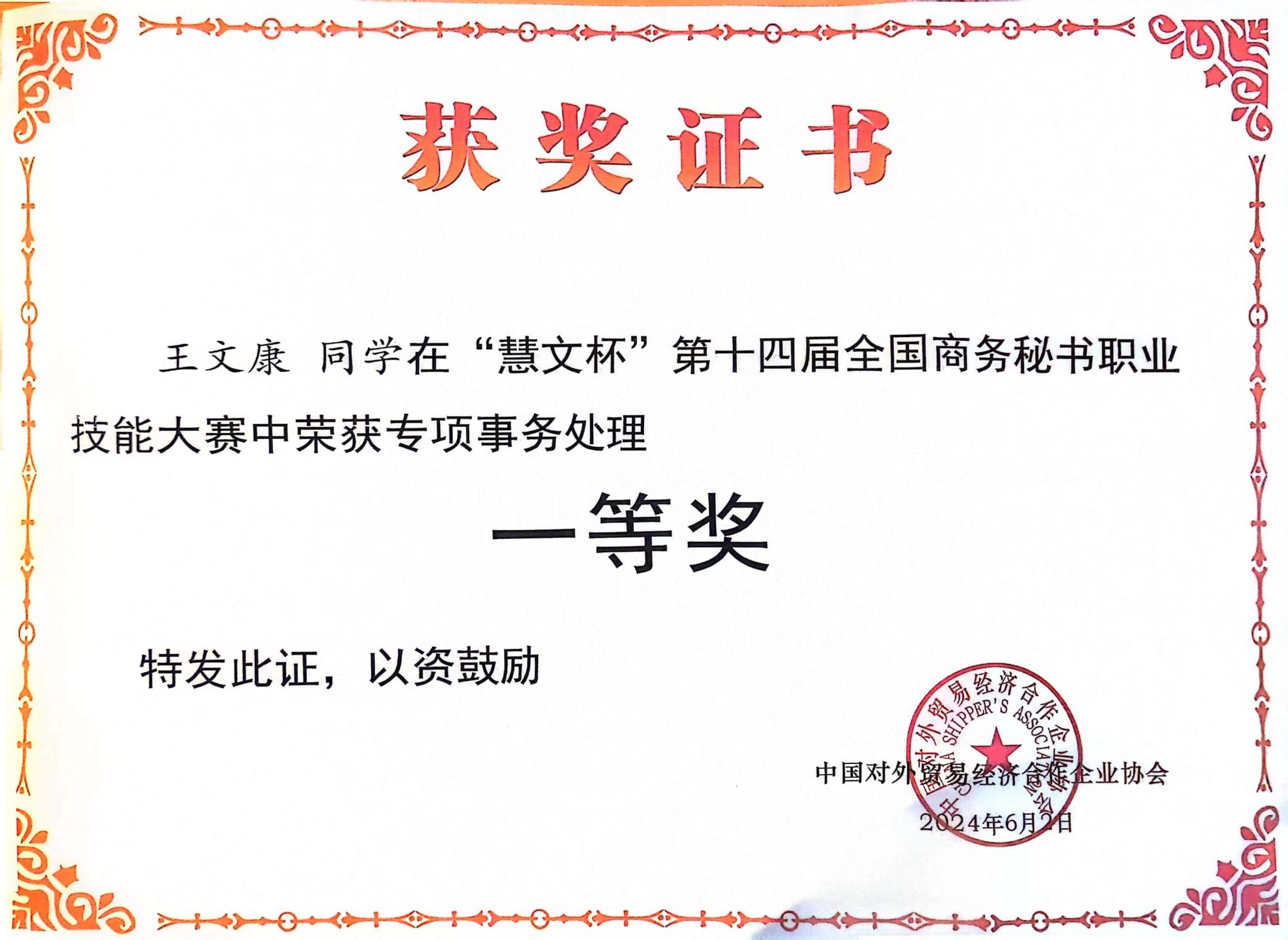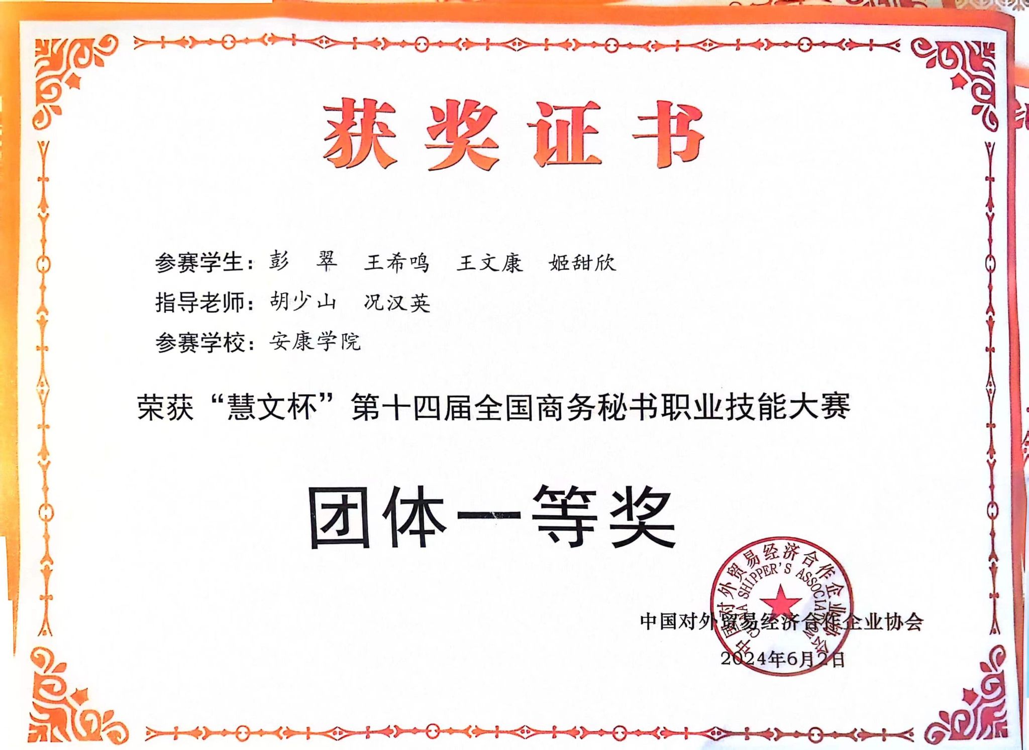 近日,“慧文杯”第十四届全国商务秘书职业技能大赛在湖南司法警官职业学院举行,来自全国24个省市自治区、68所院校的95支代表队相聚长沙、同台竞技。我校文传学院秘书学专业学子王文康、姬甜欣、王希鸣、彭翠,在指导教师胡少山、况汉英的带领下组队参赛,荣获团体一等奖、王文康荣获秘书专项事务处理竞赛一等奖。
