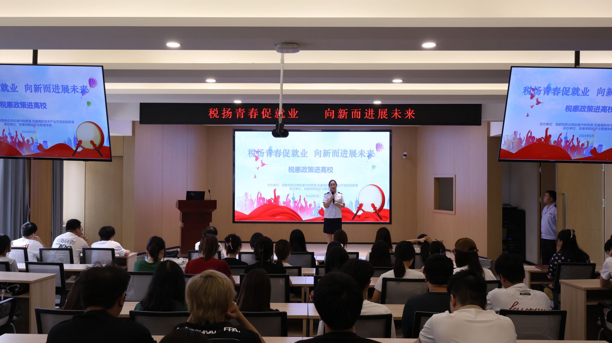 为进一步增强我校大学生税法知识,提高大学生就业创业能力,近日,大学生创新创业系列培训第四期暨大学生就业创业税惠政策宣讲活动在乡村振兴学院举行。本次活动由团委(创新创业指导办公室)主办、经管学院承办,特邀安康市税务局减税办施志鹏宣讲,财会专业师生代表100余人到场聆听。
