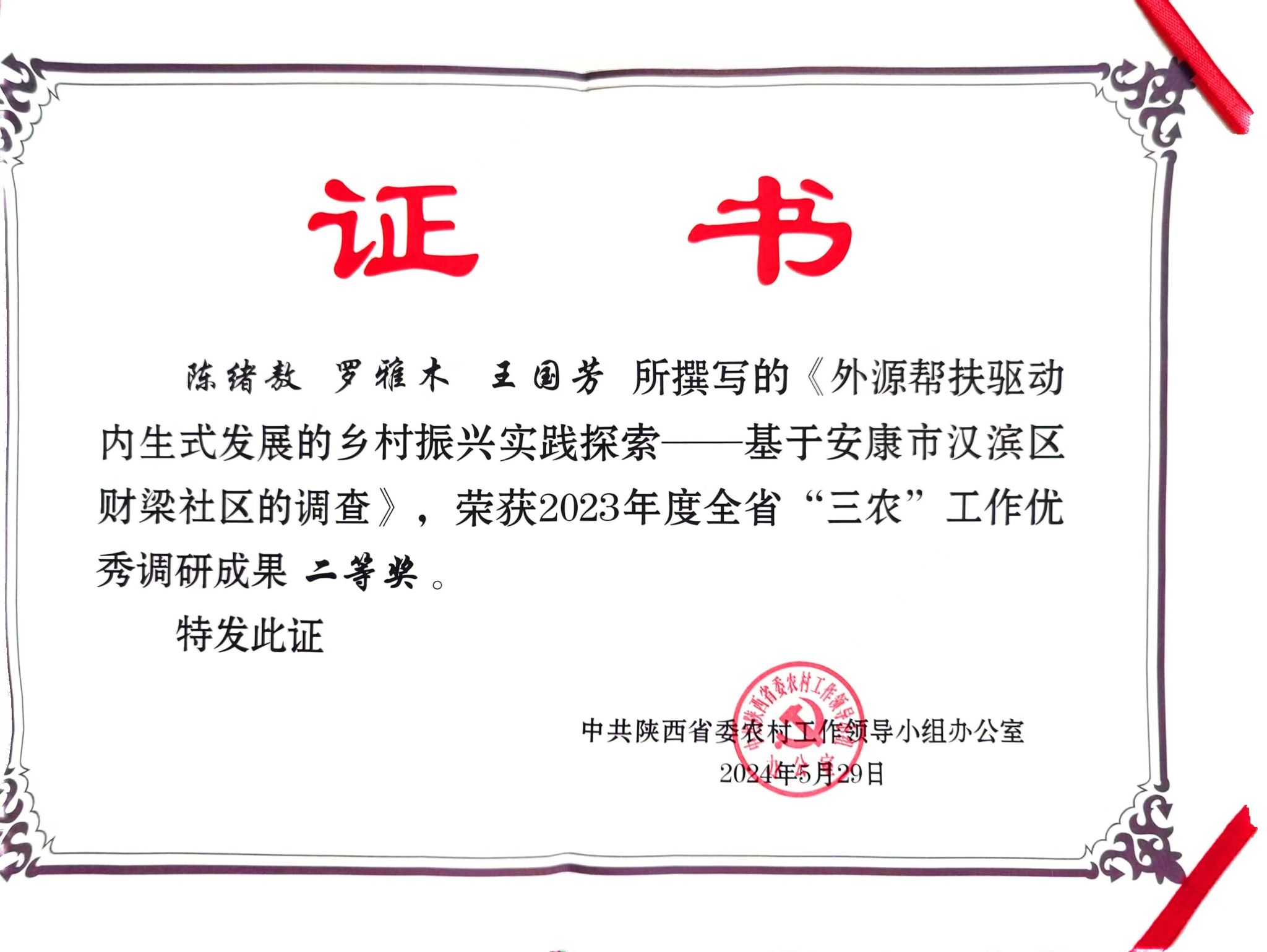 近日,根据中共陕西省委农村工作领导小组办公室文件通知,我校陈绪敖教授带领学生团队撰写的研究报告《外源帮扶驱动内生式发展的乡村振兴实践探索——基于安康市汉滨区财梁社区的调查》,荣获2023年度全省“三农”工作优秀调研成果二等奖。同时,作品被选入2023年度全省“三农”工作优秀调研成果汇编。