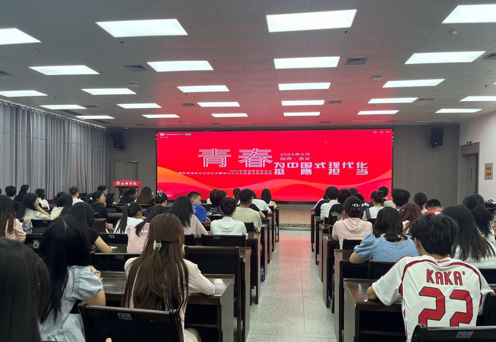 近日,由陕西省委教育工委、省教育厅主办的“青春为中国式现代化挺膺担当”2024年陕西高校毕业生西部基层就业出征仪式暨建功立业先进事迹报告活动在西安医学院隆重举行。我校组织2024、2025届学生代表共150人在江南图书馆报告厅线上参会。