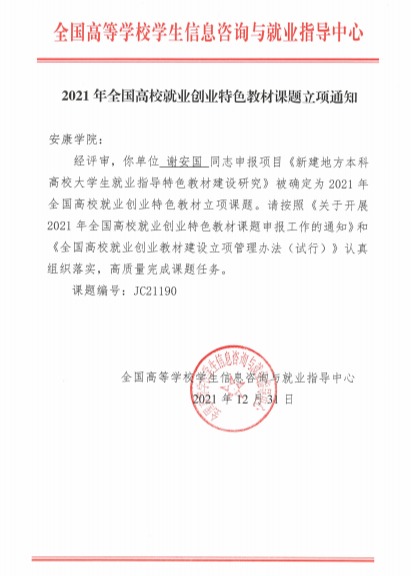 近日,我校谢安国教授团队编著的《新建地方本科高校大学生就业指导特色教材》,由西安交通大学出版社出版发行。