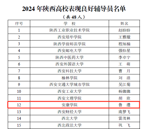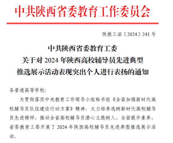 近日,省委教育工委对2024年陕西高校辅导员先进典型推选展示活动中表现突出个人进行表扬通报,我校辅导员鲁澧荣获“表现良好辅导员”称号。