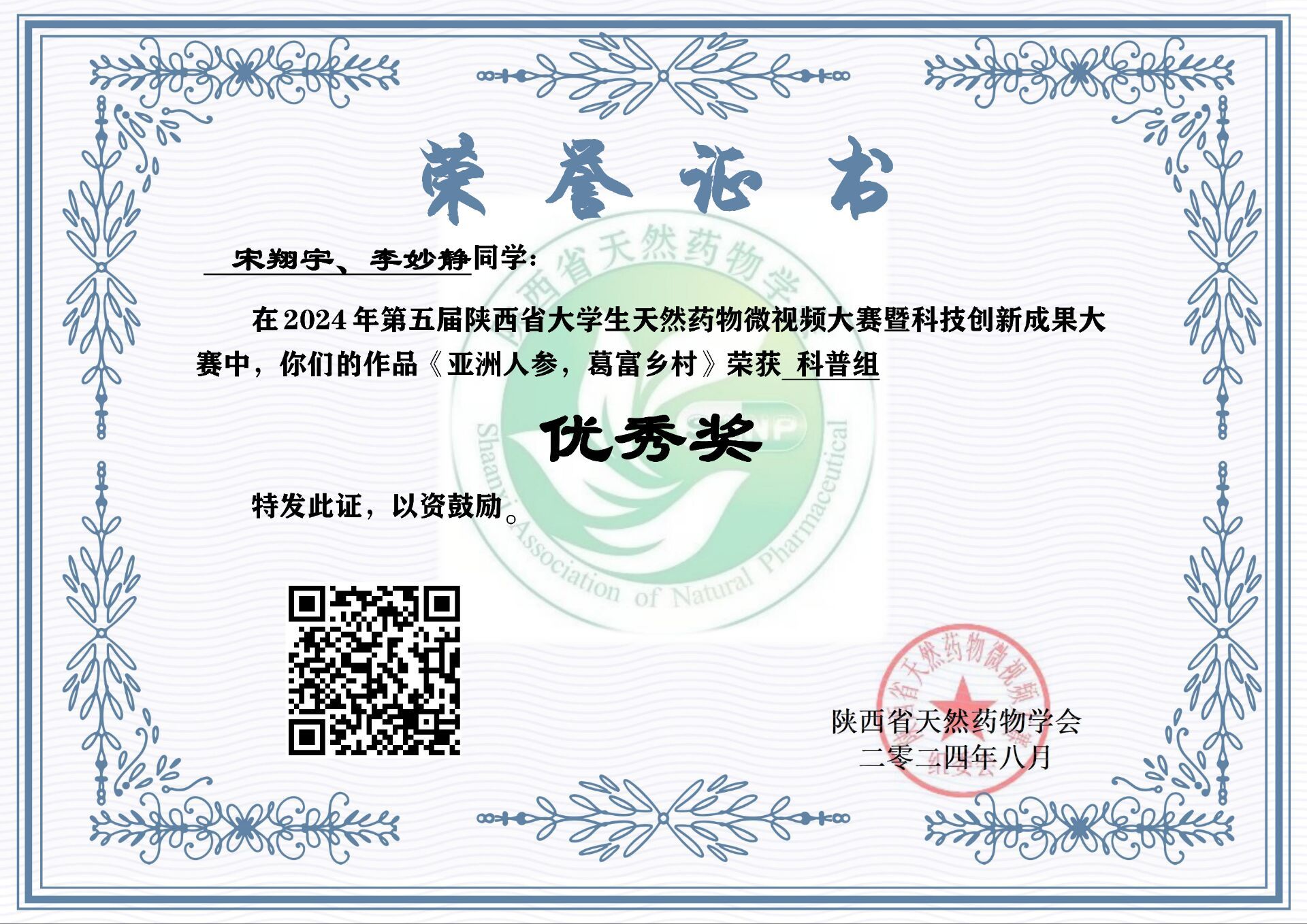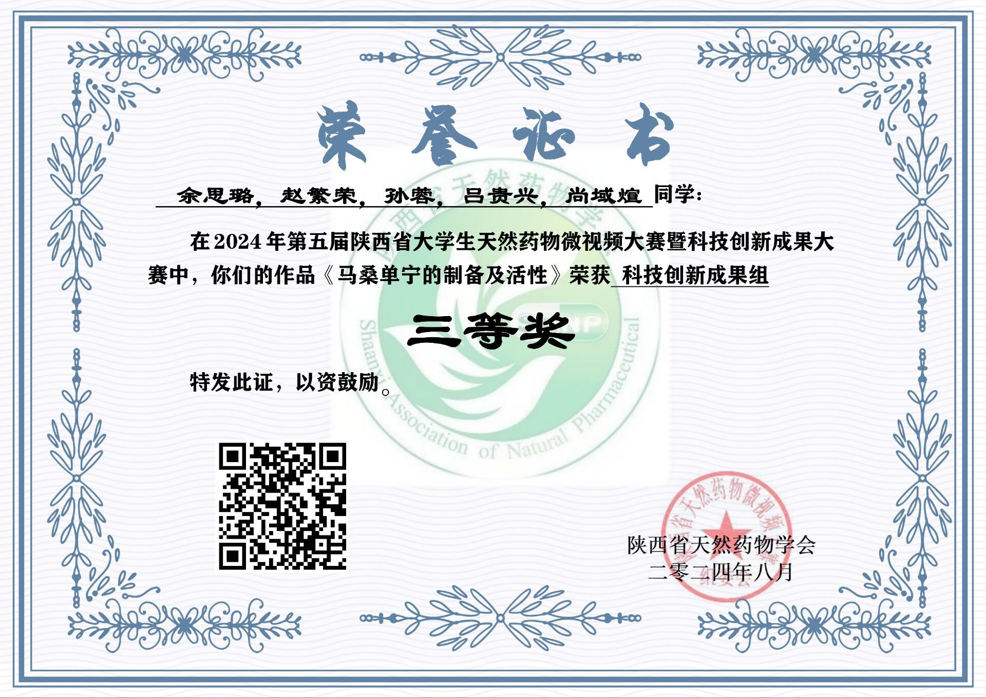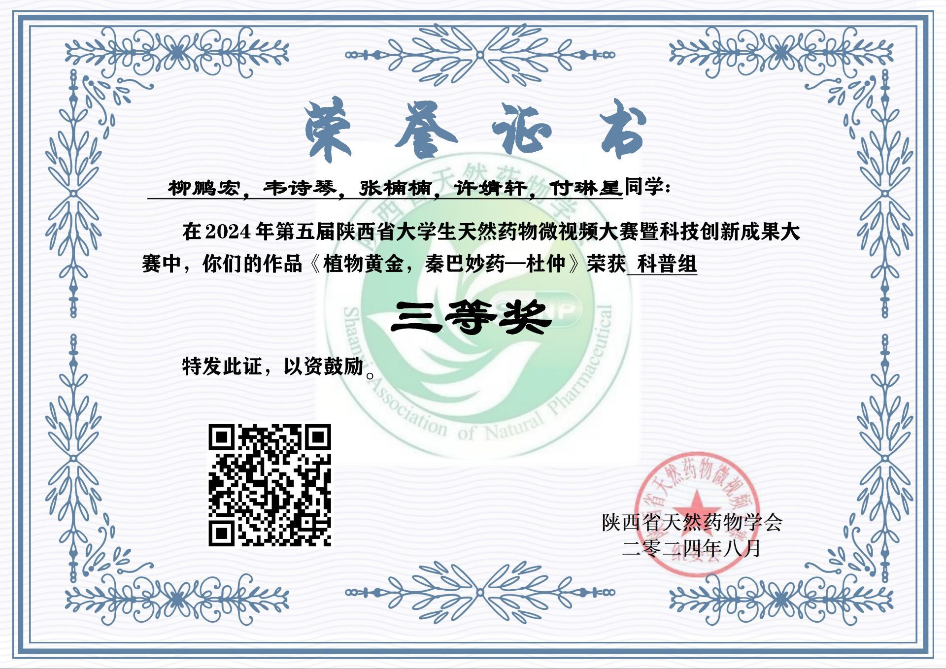 近日,由陕西省天然药物学会主办的“第五届陕西省大学生天然药物微视频大赛暨科技创新成果大赛”落下帷幕,由我校秦巴中药资源开发与利用陕西省高校工程研究中心教师谢娟平、郭林新、杨凌鉴、花俊丽指导的5个团队近20名学生(含联合培养硕士)分别获得二等奖1项,三等奖3项,优秀奖1项。