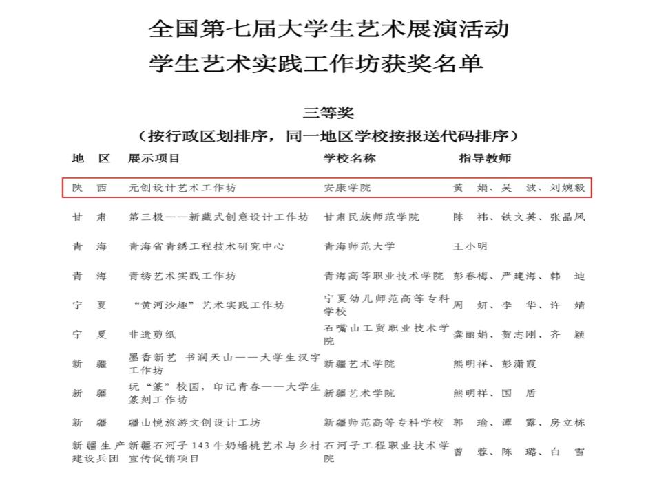 近日,教育部办公厅公布全国第七届大学生艺术展演活动评选结果,艺术学院报送的“元创设计艺术工作坊”荣获高校艺术实践工作坊项目三等奖。