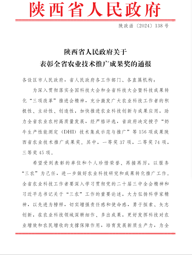 近日,陕西省人民政府发布了《陕西省人民政府关于表彰全省农业技术推广成果奖的通报》,我校教师主持、参与完成的4项成果荣获陕西省2023年度农业技术成果奖,其中一等奖1项(参与)、二等奖1项(参与)、三等奖2项(主持1项、参与1项)。