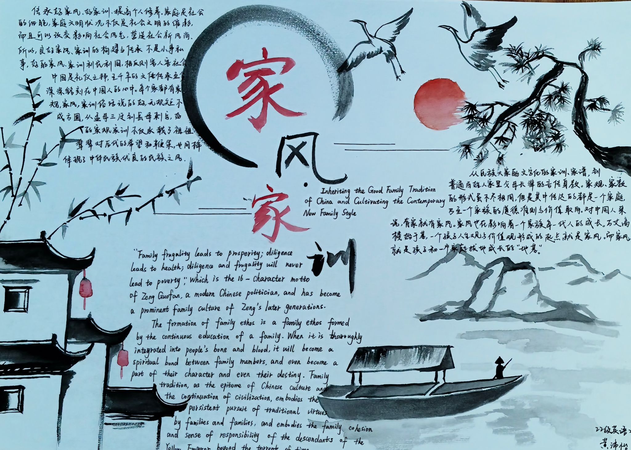 为进一步弘扬中国优秀传统家风家训文化,助力构建中国话语和中国叙事体系以及多元立体传播格局,提升大学生用外语讲好中国故事、传播中国声音的能力水平,近日,由学校纪委综合室举办、外语学院承办的“传承中华好家训,涵育当代新家风”的主题家风家训双语手抄报比赛圆满落下帷幕。