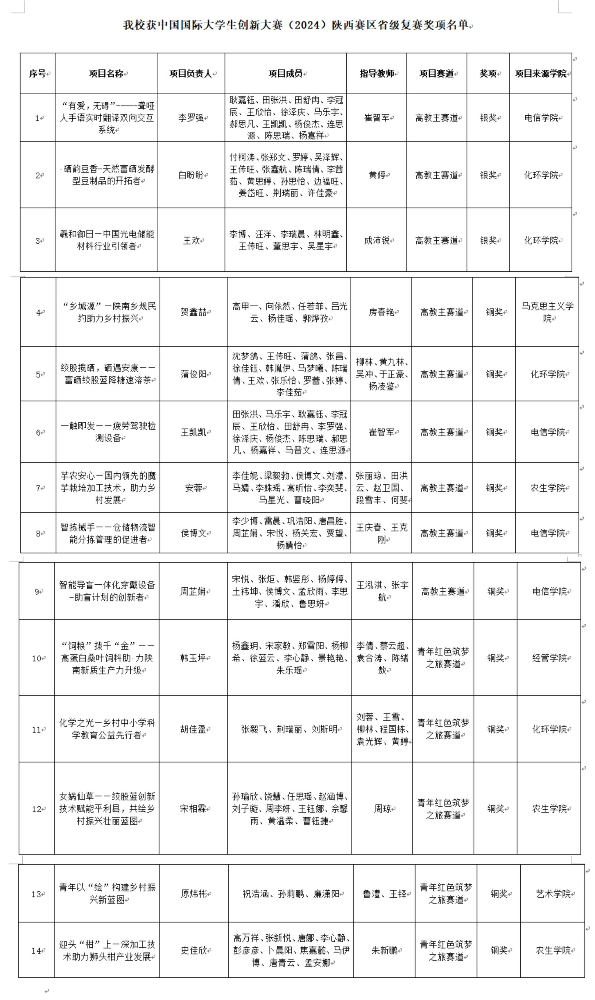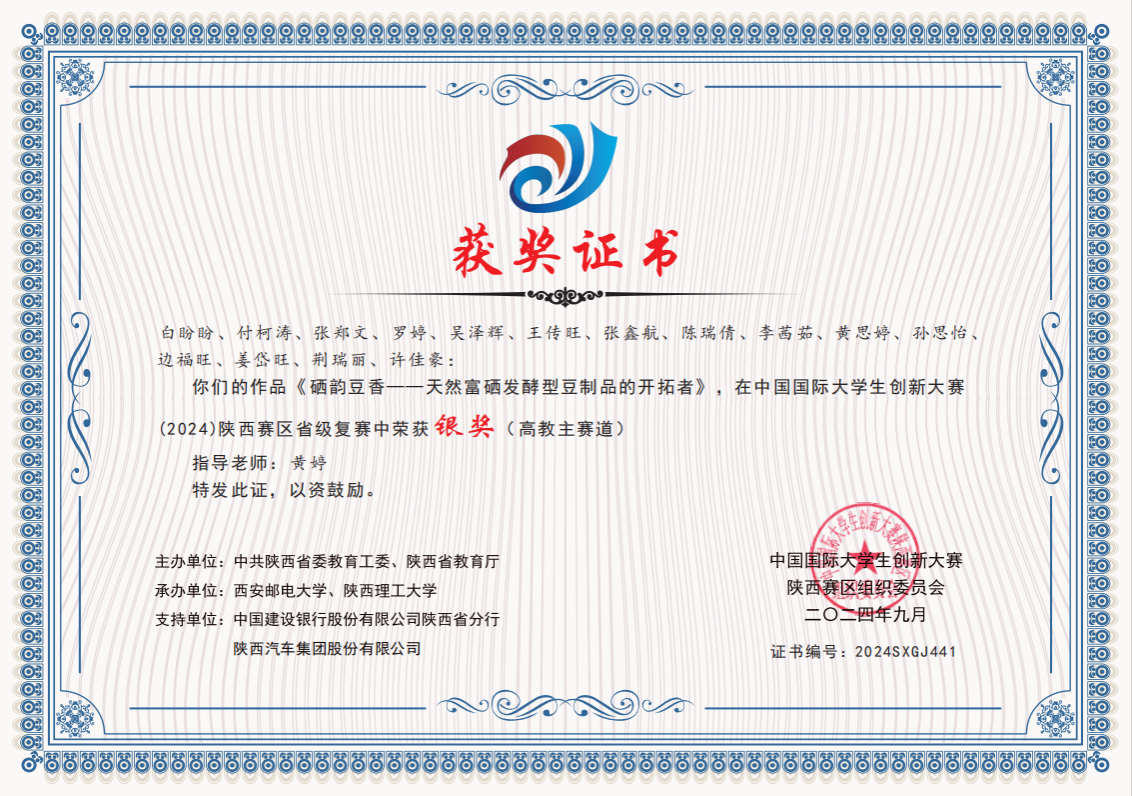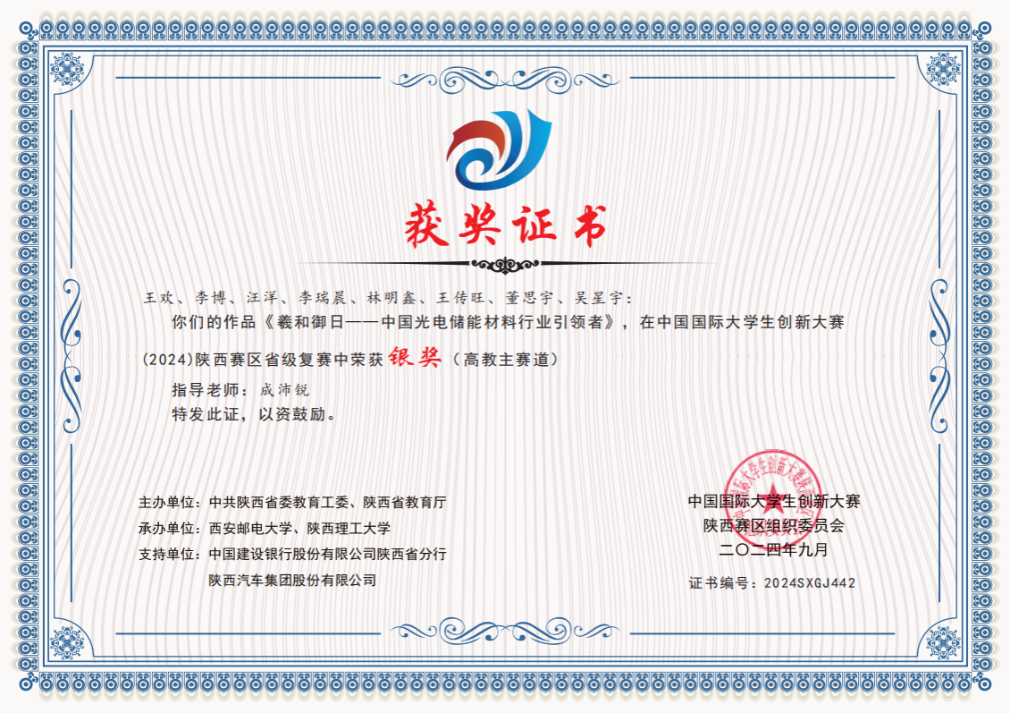近日,根据《陕西省教育厅关于公布中国国际大学生创新大赛(2024)陕西赛区省级复赛结果的通知》,我校共有14个作品获奖,其中,高教主赛道获得银奖3项、铜奖6项;“青年红色筑梦之旅”赛道获得铜奖5项。我校化学与环境学院《硒韵豆香-天然富硒发酵型豆制品的开拓者》《羲和御日—中国光电储能材料行业引领者》、电子与信息工程学院《“有爱,无碍”——聋哑人手语实时翻译双向交互系统》获得高教主赛道银奖。