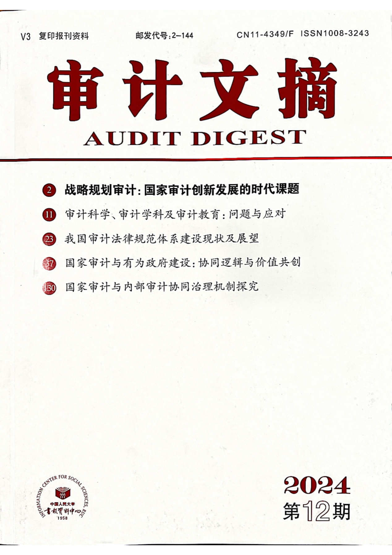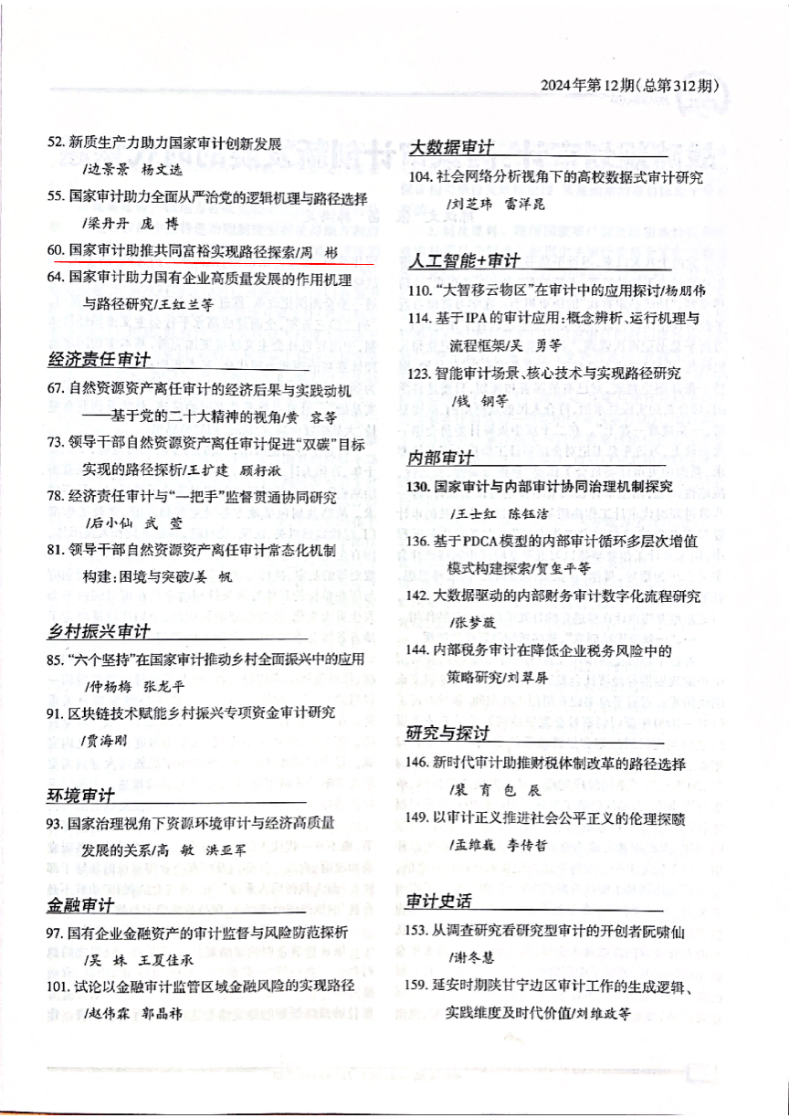 近日,从中国人民大学复印报刊资料数据库获悉,我校学报2024年第4期刊发的论文《国家审计助推共同富裕实现路径探索》被人大复印报刊资料《审计文摘》2024年第12期全文转载。