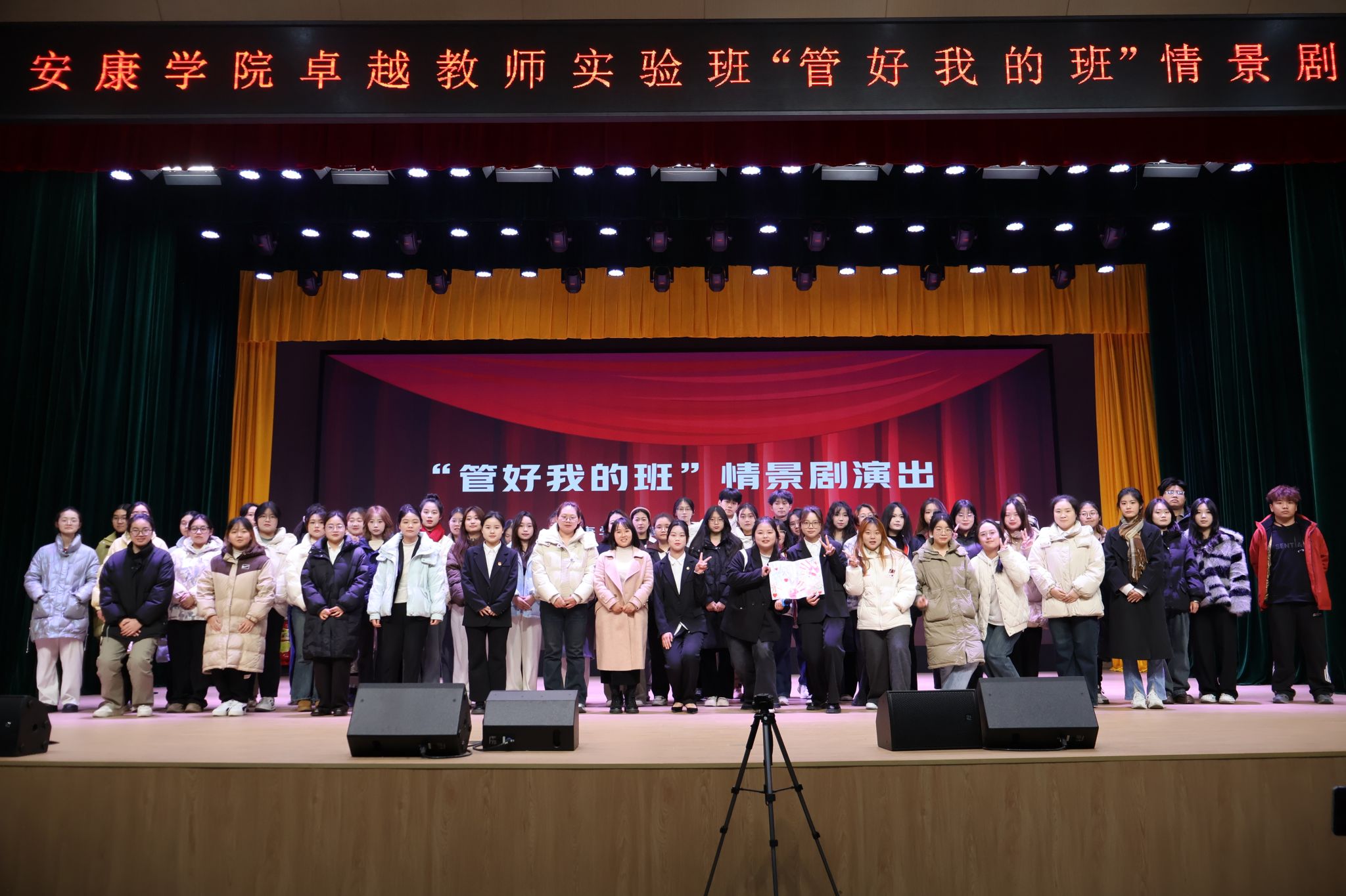近日,我校卓越教师实验班在江南校区大礼堂成功举办“管好我的班”情景剧演出。师范生职业技能训练中心主任崔炜荣,卓越教师实验班班主任刘玮、黄娟,以及卓越教师实验班全体同学到场观看演出。在班委出场秀环节,经过前期自荐和综合选拔所产生的卓越教师实验班班委学生以武术、小品、合唱、书法和绘画表演等丰富多彩的形式展现了个人特长和专业特色。