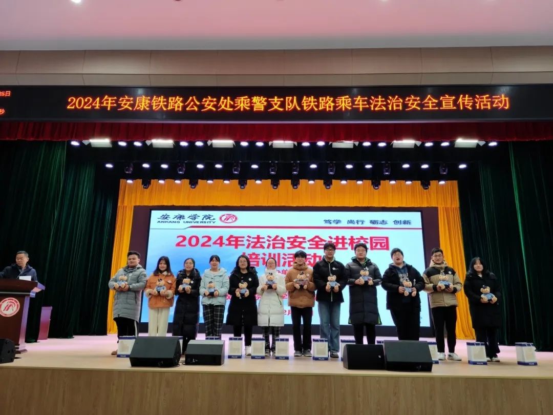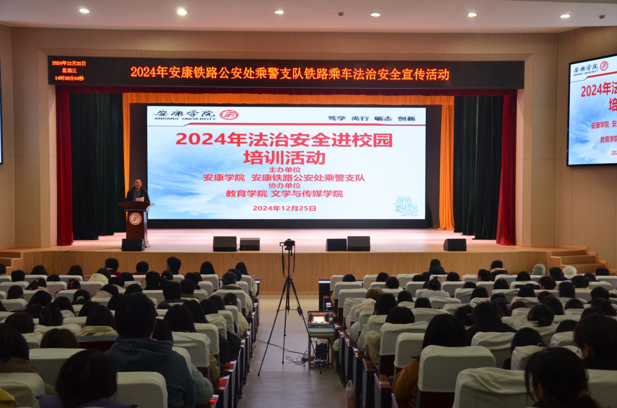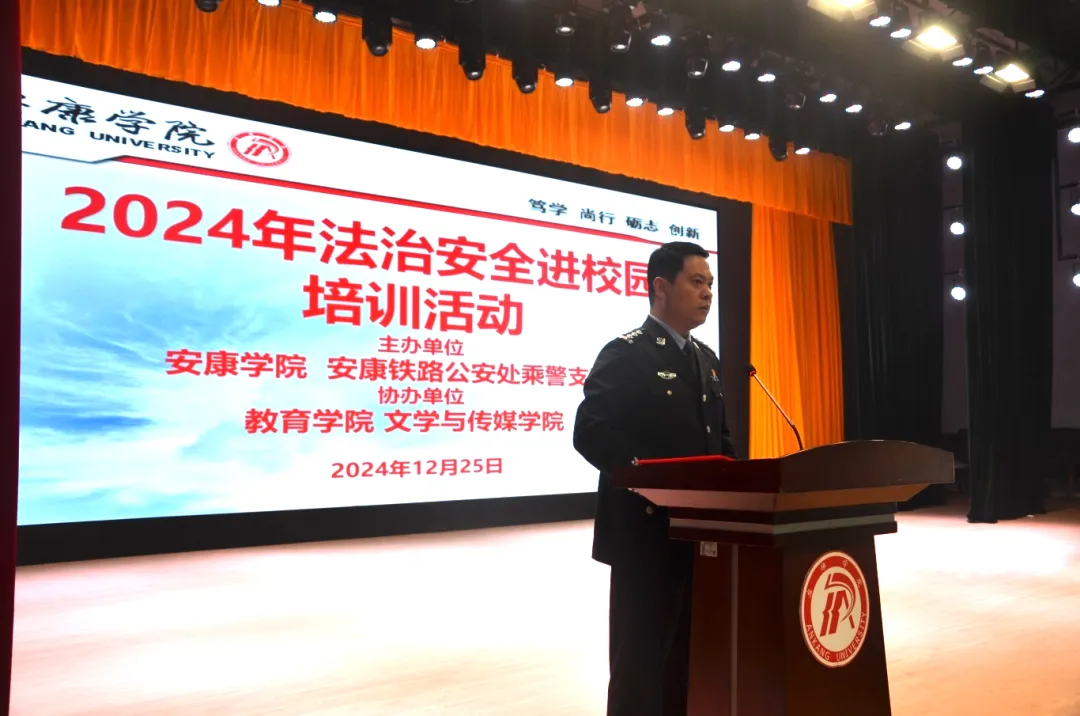 12月25日下午,我校联合安康铁路公安处乘警支队开展法治安全进校园宣传教育活动。安康铁路公安处乘警支队支队长董杰松,党委保卫部部长王开忠、学校稳定安全工作领导小组成员单位以及师生代表700余人参加主会场培训,活动由王开忠主持,并面向全校师生员工直播。
