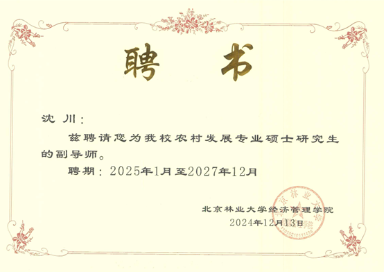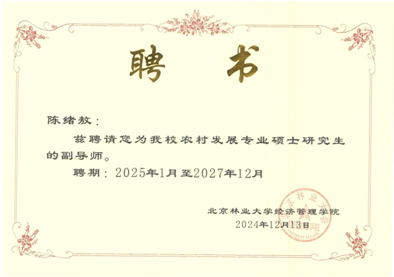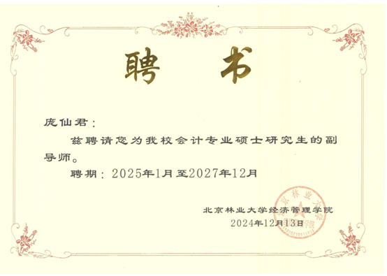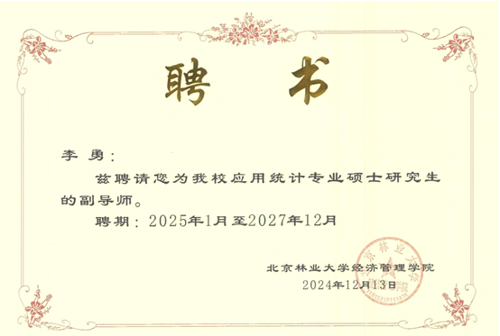 近日,根据北京林业大学硕士研究生指导教师遴选结果,我校经管学院李勇、陈绪敖、李本庆、沈川、庞仙君五位教师获聘为北京林业大学经济管理学院硕士研究生副导师。至此,经管学院具有兼职硕士生导师达到8人,这是学院在学科建设与人才培养方面取得的又一重要成果。