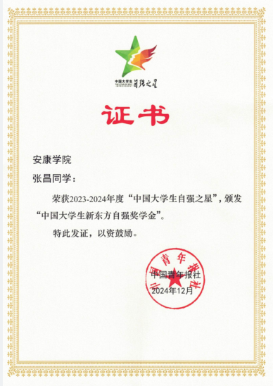 近日,经高校推荐、省级初评、全国评审等环节,2024年度“中国大学生自强之星”评定结果揭晓。我校化学与环境学院优秀学子张昌荣获2023-2024年度“中国大学生自强之星”荣誉称号。