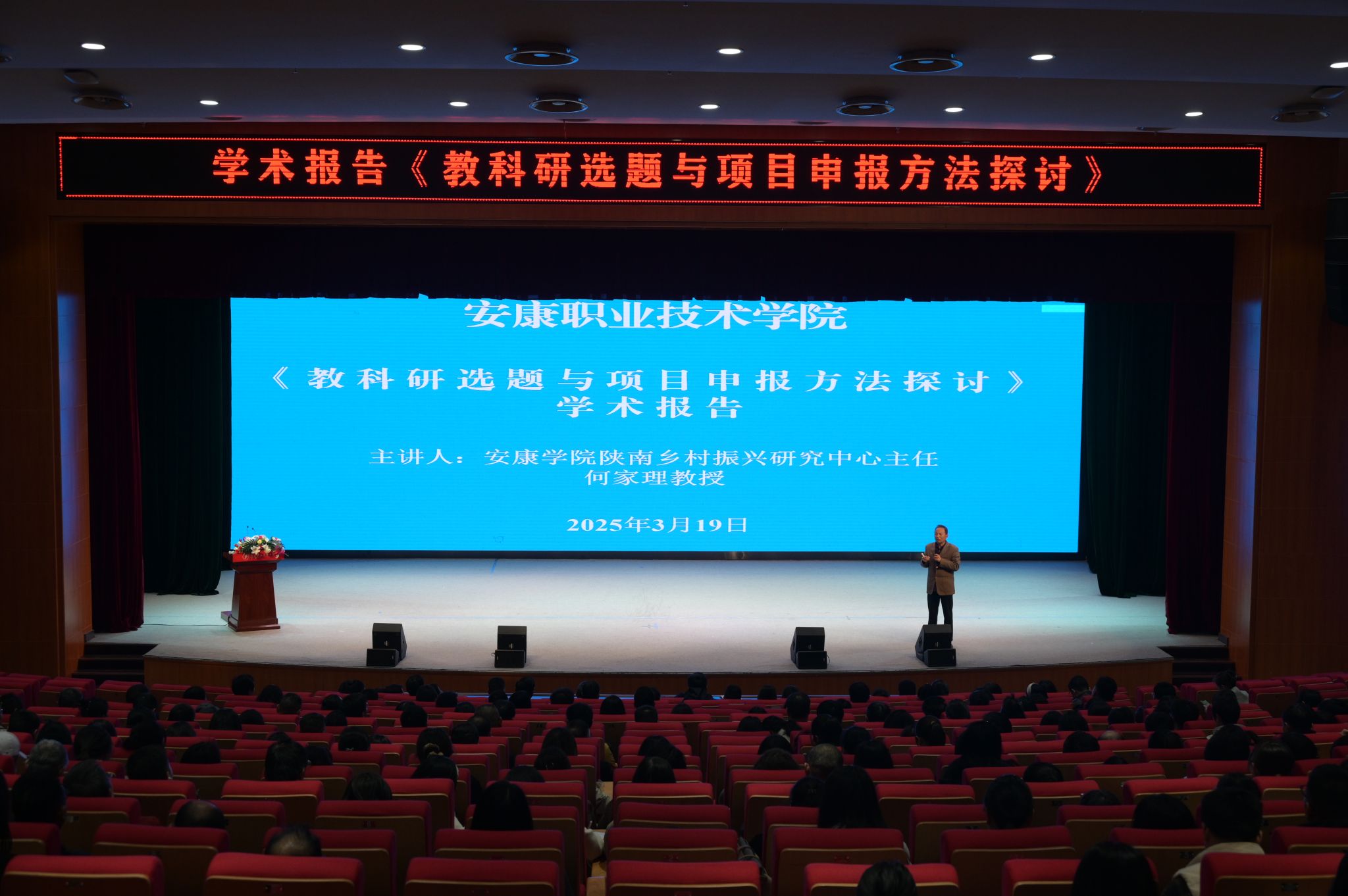 3月19日下午,应安康职业技术学院邀请,我校陕南乡村振兴研究中心主任何家理教授在该校二楼学术报告厅为全校教师作题为《教科研选题与项目申报方法探讨》的学术报告,全校400余名无课教师参加了会议。会议由安康职业技术学院党委委员、副院长蔡彬主持。