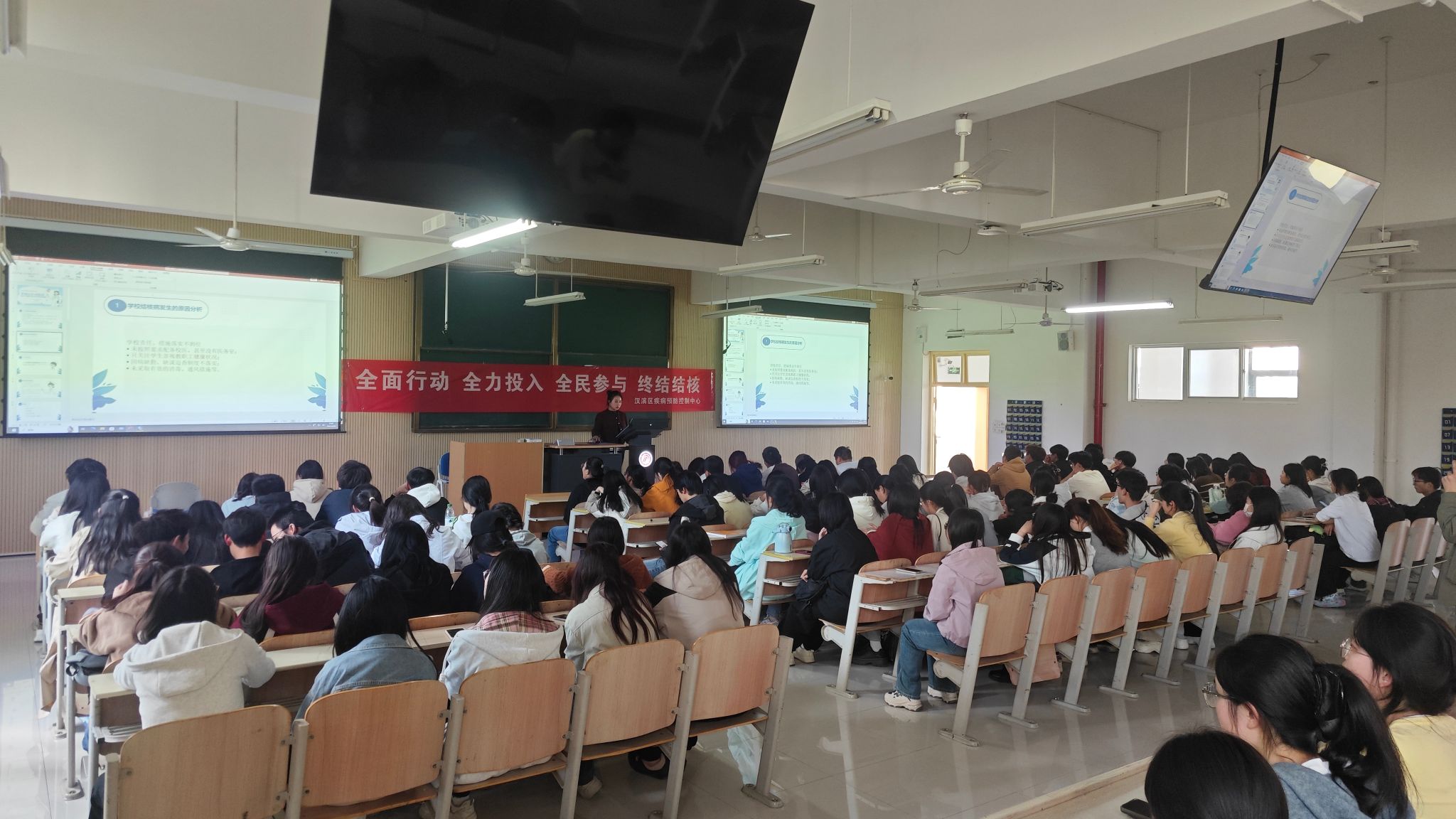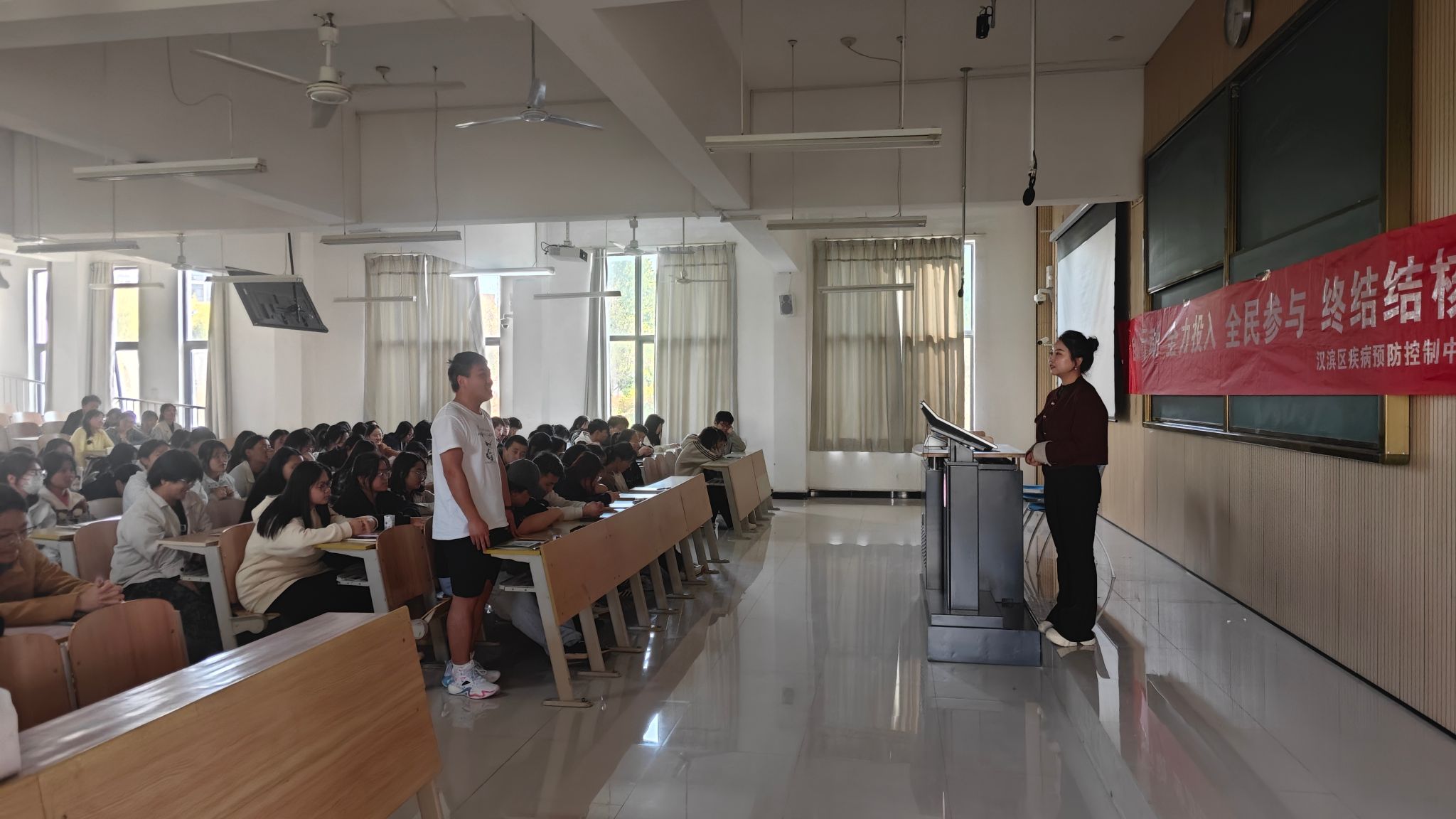下午,汉滨区疾病预防控制中心结核病防治科科长胡天怡应邀为我校200余名师生作专题报告。胡天怡结合高校特点,系统讲授校园结核病防控要点。在互动环节,同学们积极响应,踊跃参与。