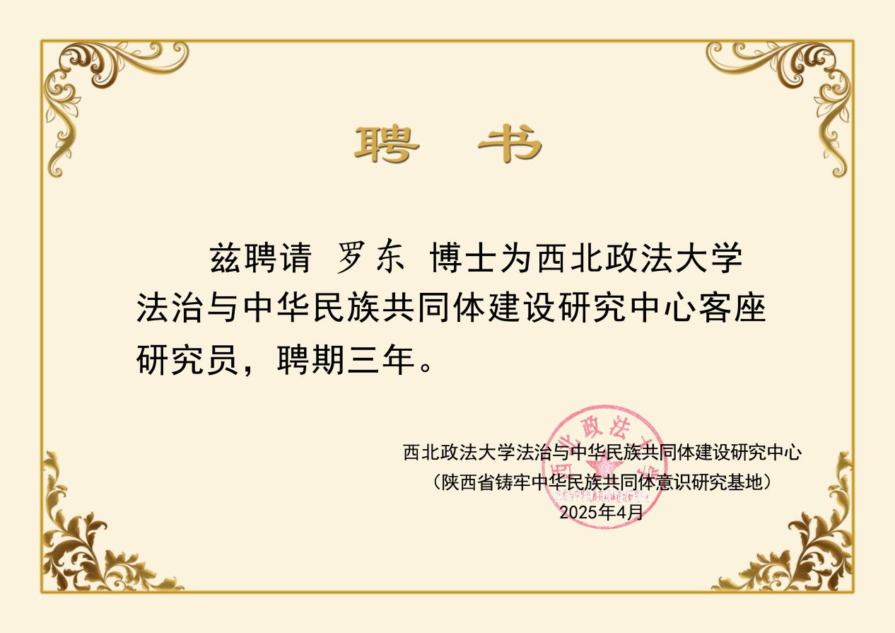 近日,我校马克思主义学院青年教师罗东博士受聘为西北政法大学法治与中华民族共同体建设研究中心客座研究员。