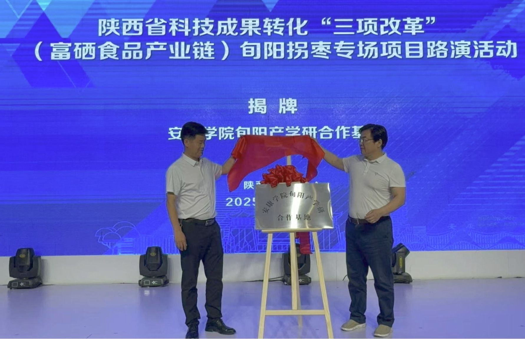 在与会嘉宾的共同见证下,王健代表学校与旬阳市政府副市长沈纪兵共同为“安康学院 旬阳产学研合作基地”揭牌,标志着我校与旬阳市的校地合作迈入了全新阶段。该基地将围绕拐枣功能食品开发展开深度科研攻关,充分挖掘拐枣产业巨大潜力,通过提升产品附加值,推动科技成果转化落地,为当地产业升级持续注入强劲动力。