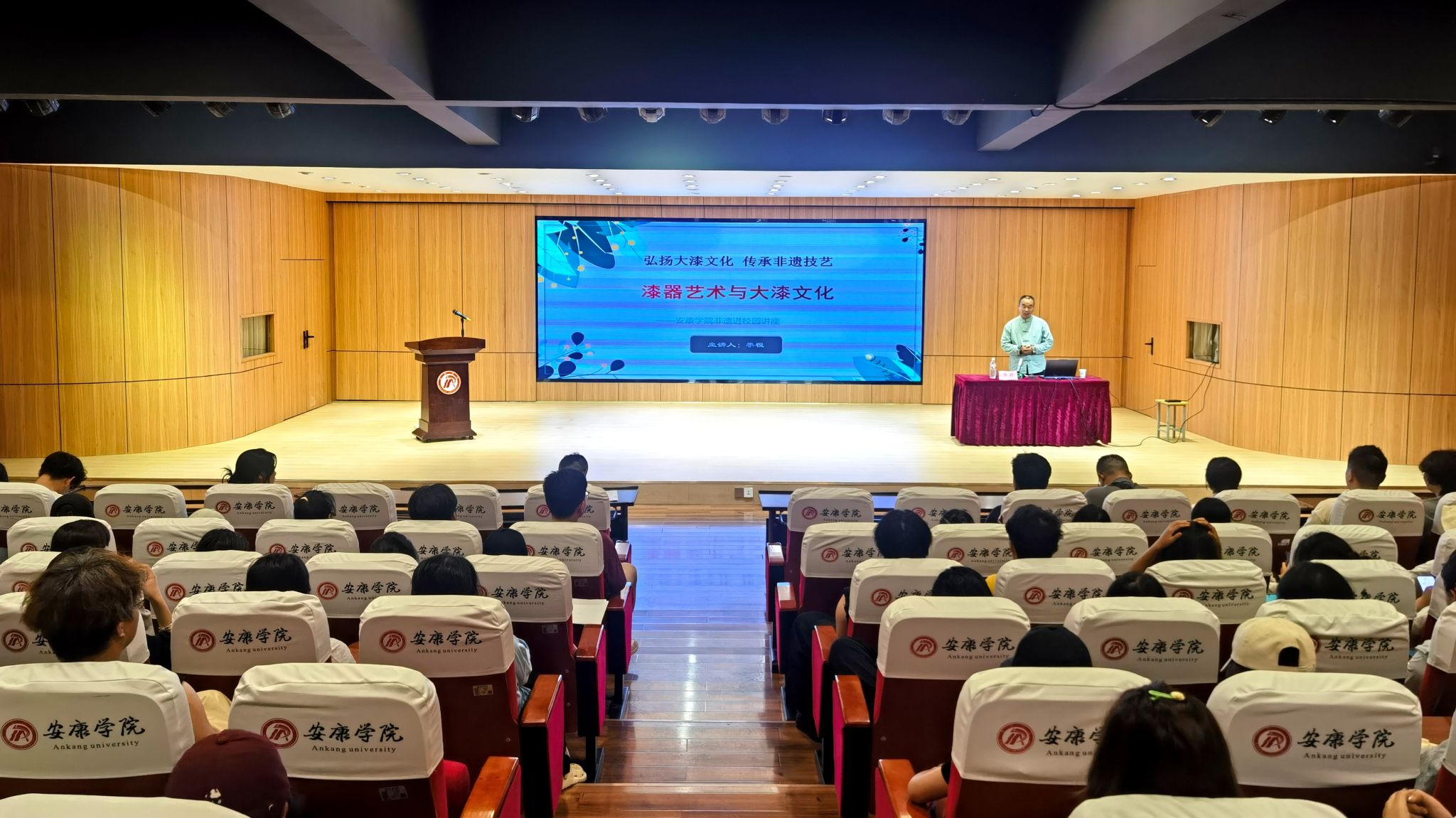 报告会上,李程介绍了传承8000余年的中华漆艺文明,梳理了中国漆艺的发展现状,分享了漆画、漆器作品赏析的技巧,用渊博的学识与鲜活的案例,让师生们触摸到漆艺“始于实用,终于艺术”的千年温度,看到了非遗在校园土壤中生根的无限可能。同时还结合本人经历,向师生们展示了矢志不渝追求梦想、传承弘扬非遗文化的坚韧品格,让这场学术报告不仅是一场漆器艺术、漆器文化的知识课堂,更是一次鲜活的思想政治教育。