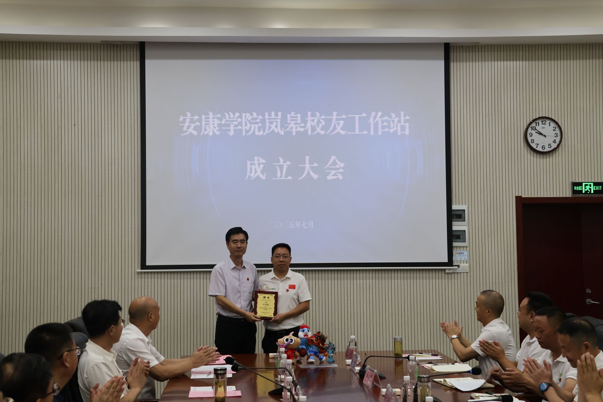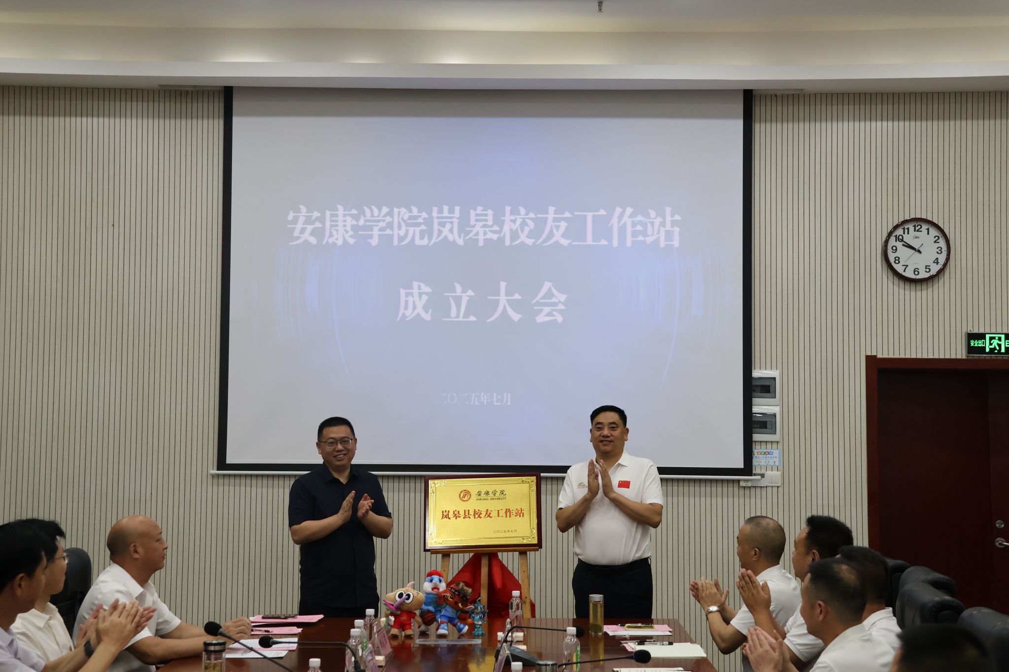余谦与王仁康共同为 “安康学院岚皋校友工作站” 揭牌;屈险峰为工作站站长石有新颁发聘书;石有新代表工作站作表态发言。