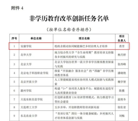据悉,我校继续教育学院查芳教授团队的“校政企联动协同赋能秦巴乡村治理人才培养”项目于2024年申报,并于2025年2月成功入选教育部《2024年学习型社会建设重点任务》(高等继续教育领域)“非学历教育改革创新”类重点任务,全国共入选103项。陕西省此次共有长安大学和安康学院两个单位在该类别中入选。截至目前,陕西省累计入选教育部学习型社会建设重点任务23项,其中“非学历教育改革创新”类别占5项。