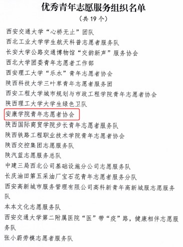 近日,陕西省青年志愿者协会通报表扬2024年度优秀组织,我校青年志愿者协会成功入选,成为全省19个获此殊荣的组织之一!