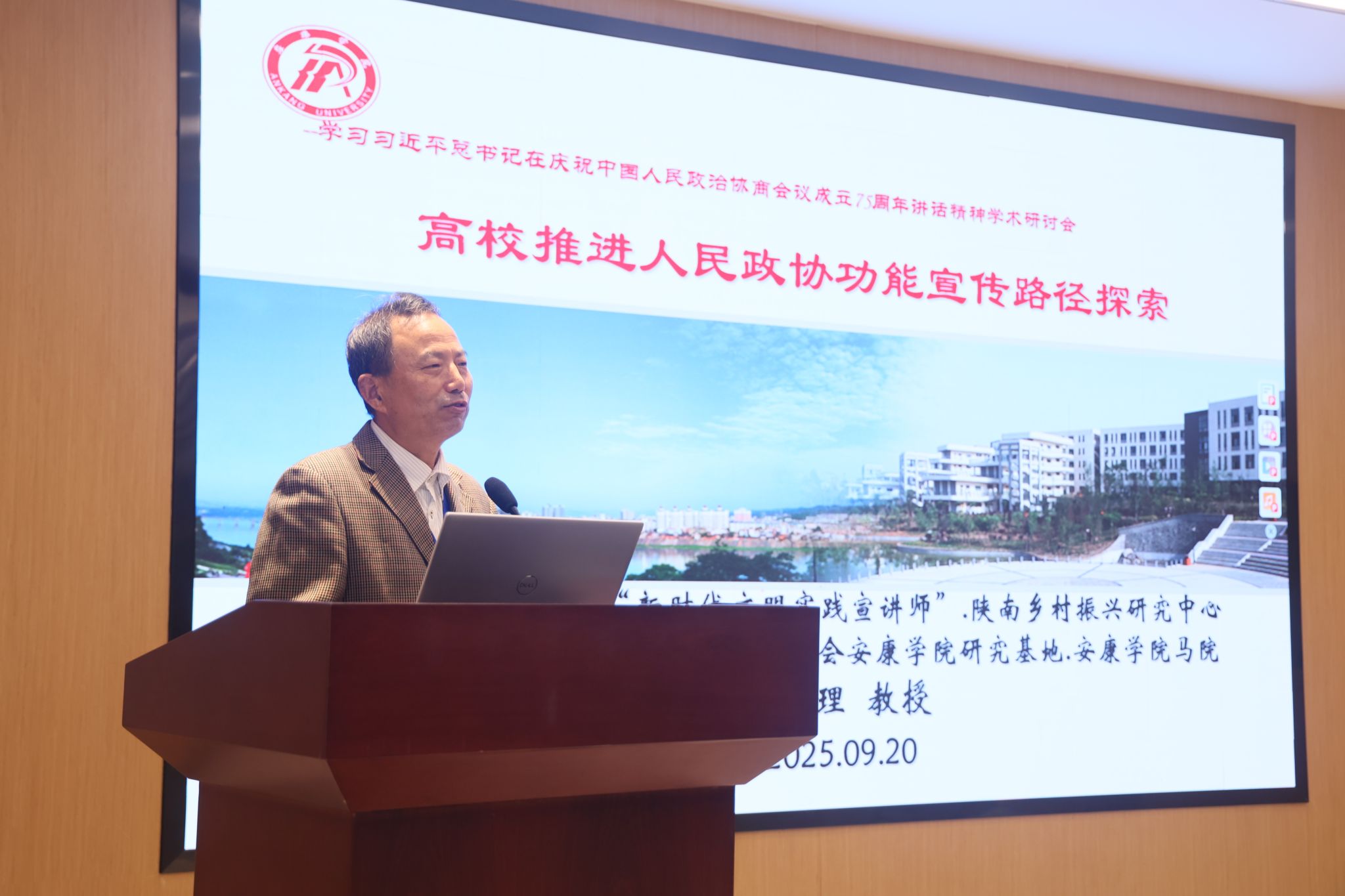 9月20日,在习近平总书记庆祝中国人民政治协商会议成立75周年大会上的重要讲话发表一周年之际,由陕西省人民政协理论与实践研究会安康学院研究基地主办、科研处协办的“学习习近平总书记在庆祝中国人民政治协商会议成立75周年大会上的重要讲话精神 探索全过程人民民主中政协优势的实践路径”学术研讨会在安康学院江北校区乡村振兴学院学术报告厅隆重召开。