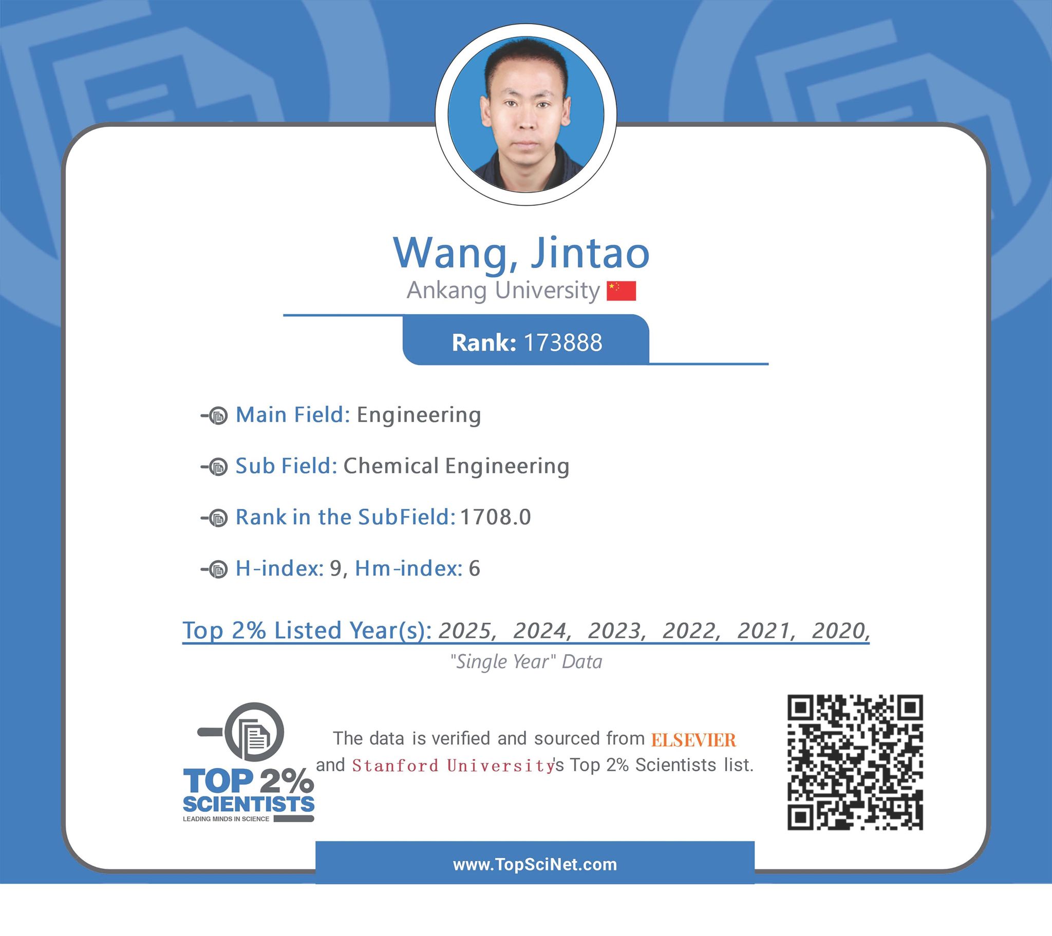 9月19日,美国斯坦福大学携手全球知名学术出版机构Elsevier共同发布了2025年度“全球前2%顶尖科学家”榜单,我校科创驿站驻站博士王锦涛教授再次入选。这是王锦涛教授自2020年以来,连续第六年获得此项荣誉,彰显了我校在科学研究领域的国际影响力。
