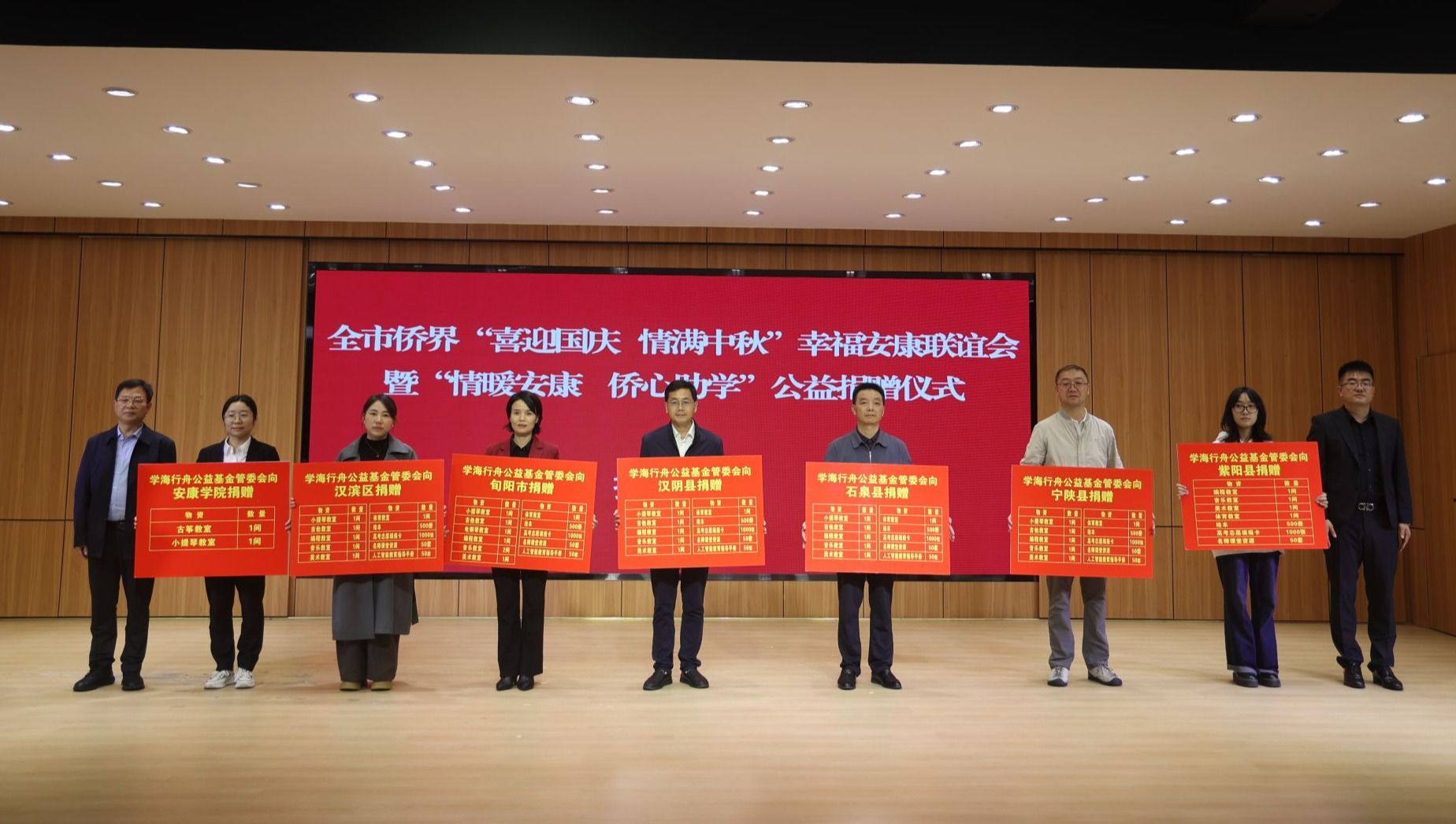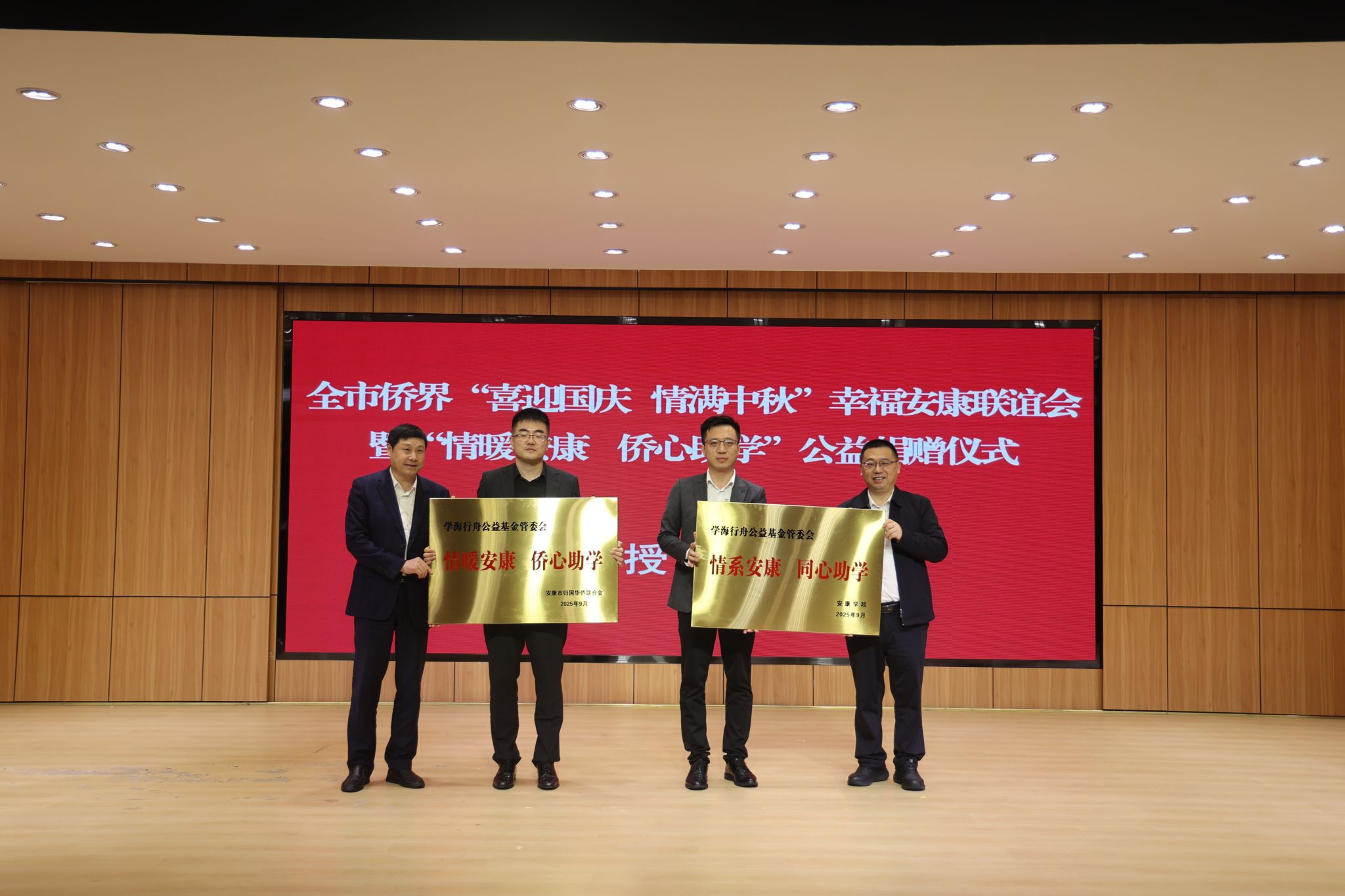 秋色如画,丹桂飘香;双节将至,情谊绵长。9月29日下午,全市侨界“喜迎国庆情满中秋”幸福安康联谊会暨“情暖安康侨心助学”公益捐赠仪式在我校隆重举行。本次活动由安康市侨联、安康学院共同承办,省侨联、学海行舟公益基金管委会、市委统战部、市教体局及各县(市、区)侨务工作者、受赠学校师生代表、侨界人士等200余人齐聚校园,共话桑梓情谊,共绘发展蓝图。