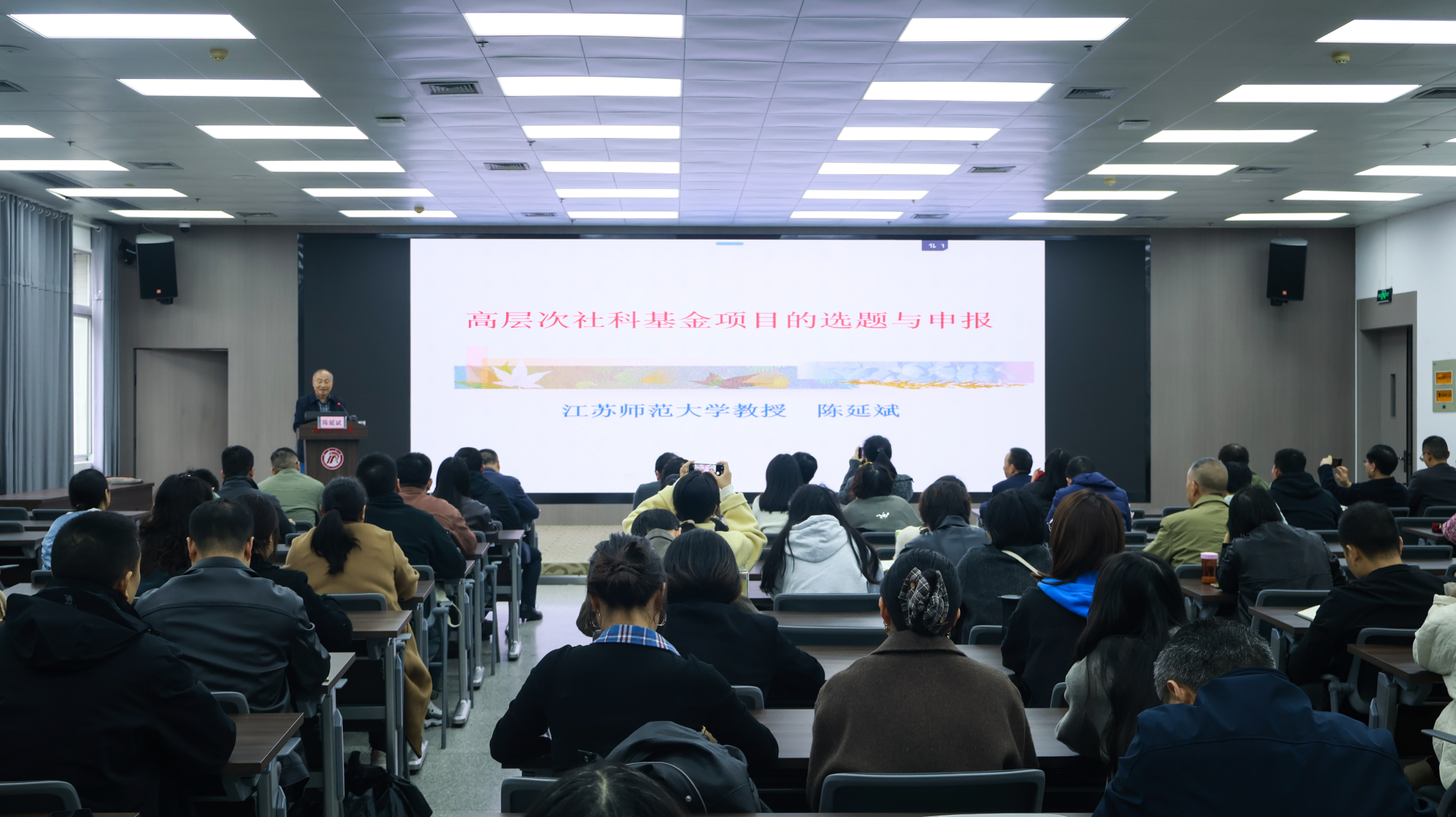为提升我校教师高层次科研项目申报质量,做好2026年国家社科基金项目申报工作,近日,江苏师范大学二级教授陈延斌应邀为我校教师作题为“高层次社科基金项目的选题与申报”辅导报告。副校长崔晓明出席报告会,文传学院及相关二级学院教师参会,会议由文传学院院长杨运庚主持。