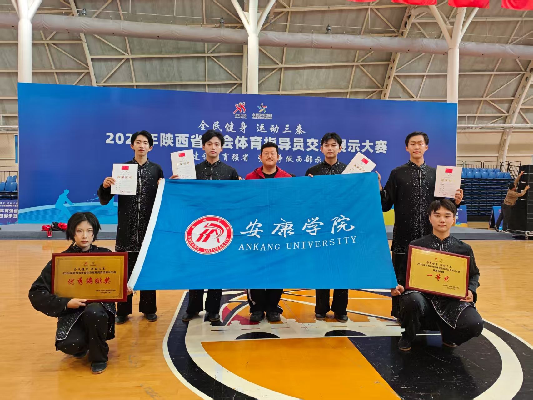 11月3日至5日,“全民健身 运动三秦” 2025年陕西省社会体育指导员交流展示大赛在咸阳市三原县圆满落幕。我校体育学院武术队应邀代表安康市参赛,凭借精湛的太极扇技艺在民族传统类项目中脱颖而出,成功斩获一等奖,充分展现了学院体育教学的扎实底蕴与学子的卓越风采。