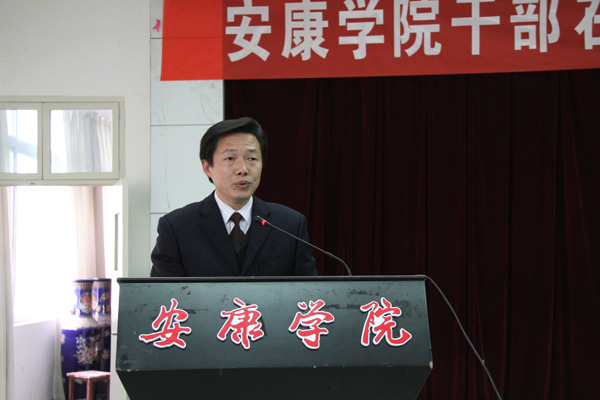 杨涛结合学院近年来干部教育培训工作的实践,就进一步提高认识、推动干部教育培训创新作了重要讲话,他强调,一要充分认识新形势下加强干部教育培训工作的重要性与必要性。首先,这是结合新的实际,继承和发展我党重视干部培训工作优良传统的必然要求。其次,这是贯彻落实科学发展观,推动学院事业发展的迫切需要。第三,这是着眼新的形势,全面提高学院中层领导干部能力素质的重要举措。要建设高品质、有特色的综合型本科大学,必须提高干部队伍的综合素质,而自身素质的提高关键在于理论学习,正如胡锦涛总书记在“七一”讲话中郑重提出,要警惕能力不足的危险。如何应对“能力危机”、化解能力不足的危险?唯一、根本而有效的方法就是始终加强学习,逐步完善自我、不断增强本领。二是加强干部教育培训的网络化建设,是适应信息化发展趋势的客观要求。为进一步丰富学习内容,完善教育载体,提高网上教育培训的针对性和实效性,我院和国家教育行政学院联合建设了“安康学院干部在线学习中心”。开通“在线学习中心”,既是信息化时代发展的客观要求,也是干部教育培训工作与时俱进、改革创新的重要体现,对我们建设学习型领导班子、学习型党组织必将起到重要的推动作用。