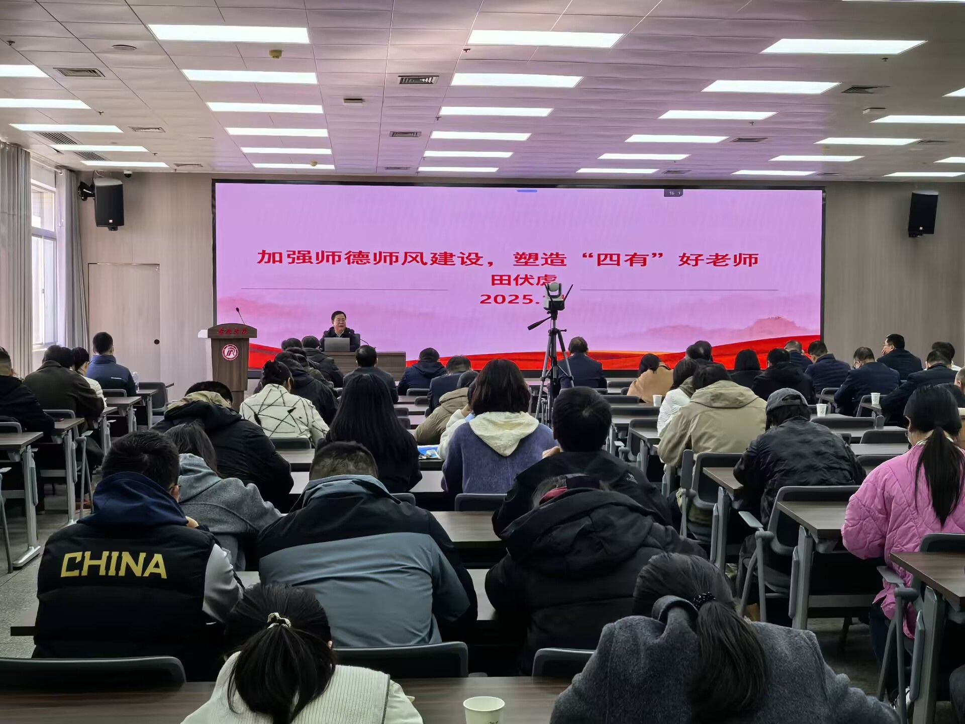 11月21日,我校在江南校区成功举办师德师风“名师讲堂”活动。本次活动特邀延安大学田伏虎教授作题为《加强师德师风建设,塑造“四有”好老师》的专题讲座。安康职业技术学院2025年新入职教师、我校近三年新进教师、副处级以上领导干部参会学习。活动由教师工作部部长汪义瑞主持。